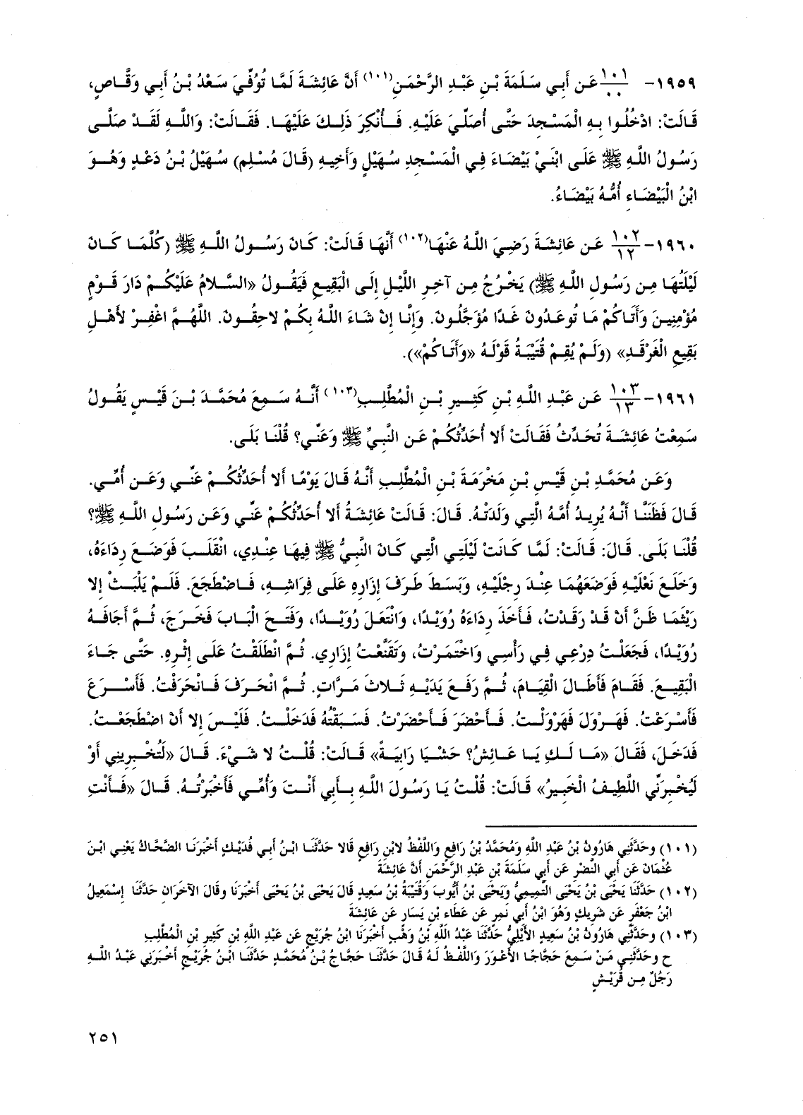 1959 - عن أبي سلمة بن عبد الرحمن أن عائشة لما توفي سعد بن أبي وقاص قالت: ادخلوا به المسجد حتى أصلي عليه. فأنكر ذلك عليها. فقالت: والله لقد صلى رسول الله صلى الله عليه وسلم على ابني بيضاء في المسجد سهيل وأخيه (قال مسلم) سهيل بن دعد وهو ابن البيضاء أمه بيضاء.