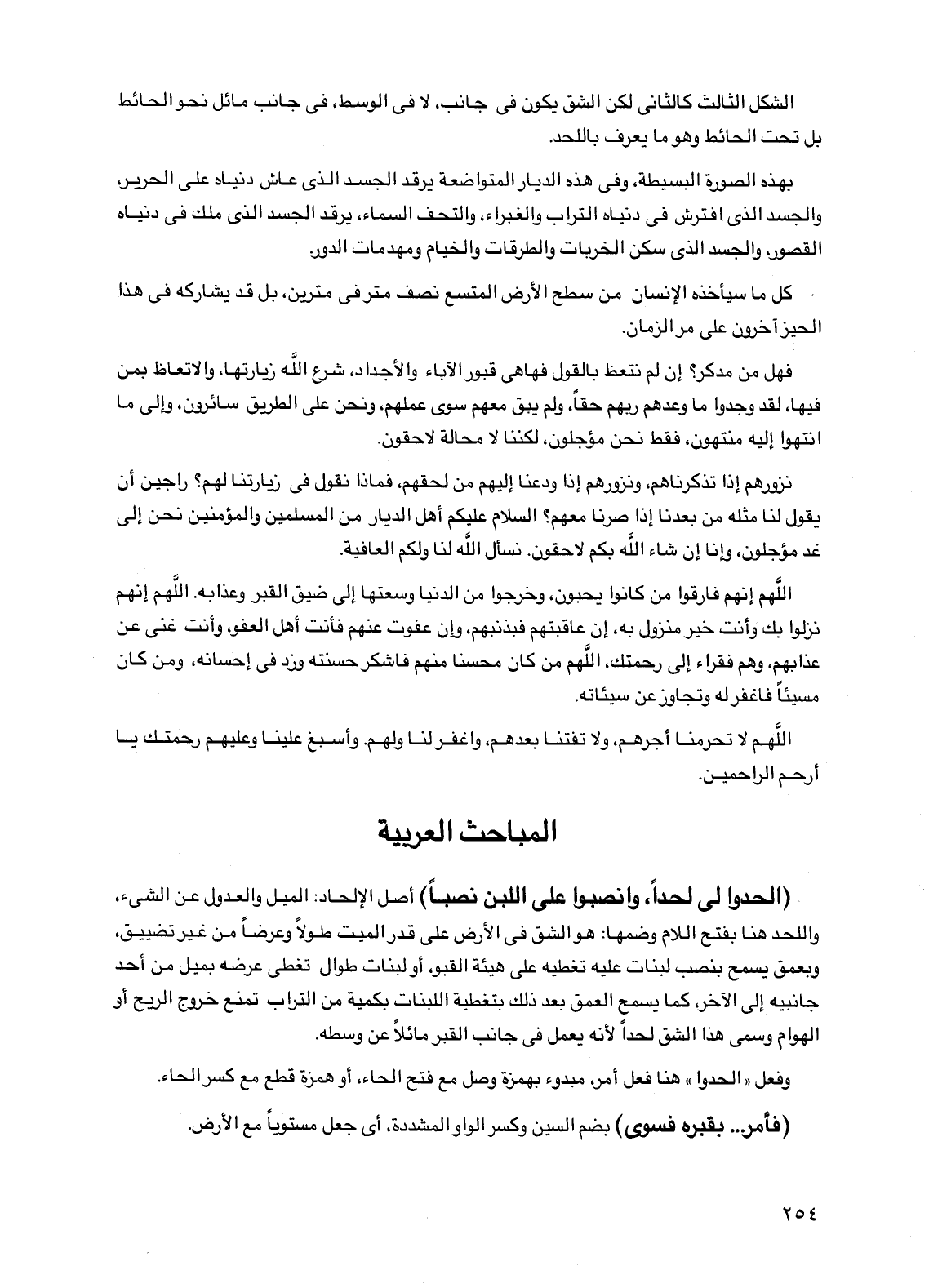 (الحدوا لي لحداً، وانصبوا على اللبن نصباً) أصل الإلحاد: الميل والعدول عن الشيء، واللحد هنا بفتح اللام وضمها: هو الشق في الأرض على قدر الميت طولاً وعرضاً من غير تضييق، وبعمق يسمح بنصب لبنات عليه تغطيه على هيئة القبو، أو لبنات طوال تغطي عرضه بميل من أحد جانبيه إلى الآخر، كما يسمح العمق بعد ذلك بتغطية اللبنات بكمية من التراب تمنع خروج الريح أو الهوام وسمى هذا الشق لحداً لأنه يعمل في جانب القبر مائلاً عن وسطه.