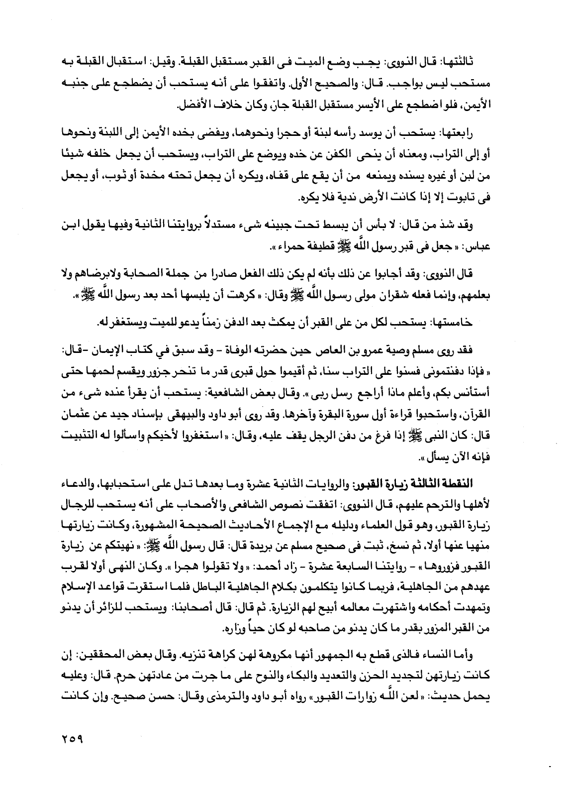 النقطة الثالثة زيارة القبور: والروايات الثانية عشرة وما بعدها تدل على استحبابها، والدعاء لأهلها والترحم عليهم، قال النووي: اتفقت نصوص الشافعي والأصحاب على أنه يستحب للرجال زيارة القبور، وهو قول العلماء ودليله مع الإجماع الأحاديث الصحيحة المشهورة، وكانت زيارتها منهياً عنها أولاً، ثم نسخ، ثبت في صحيح مسلم عن بريدة قال: قال رسول الله صلى الله عليه وسلم: "نهيتكم عن زيارة القبور فزوروها" -روايتنا السابعة عشرة- زاد أحمد: "ولا تقولوا هجراً". وكان النهي أولاً لقرب عهدهم من الجاهلية، فربما كانوا يتكلمون بكلام الجاهلية الباطل فلما استقرت قواعد الإسلام وتمهدت أحكامه واشتهرت معالمه أبيح لهم الزيارة. ثم قال: قال أصحابنا: ويستحب للزائر أن يدنو من القبر المزور بقدر ما كان يدنو من صاحبه لو كان حياً وزاره.