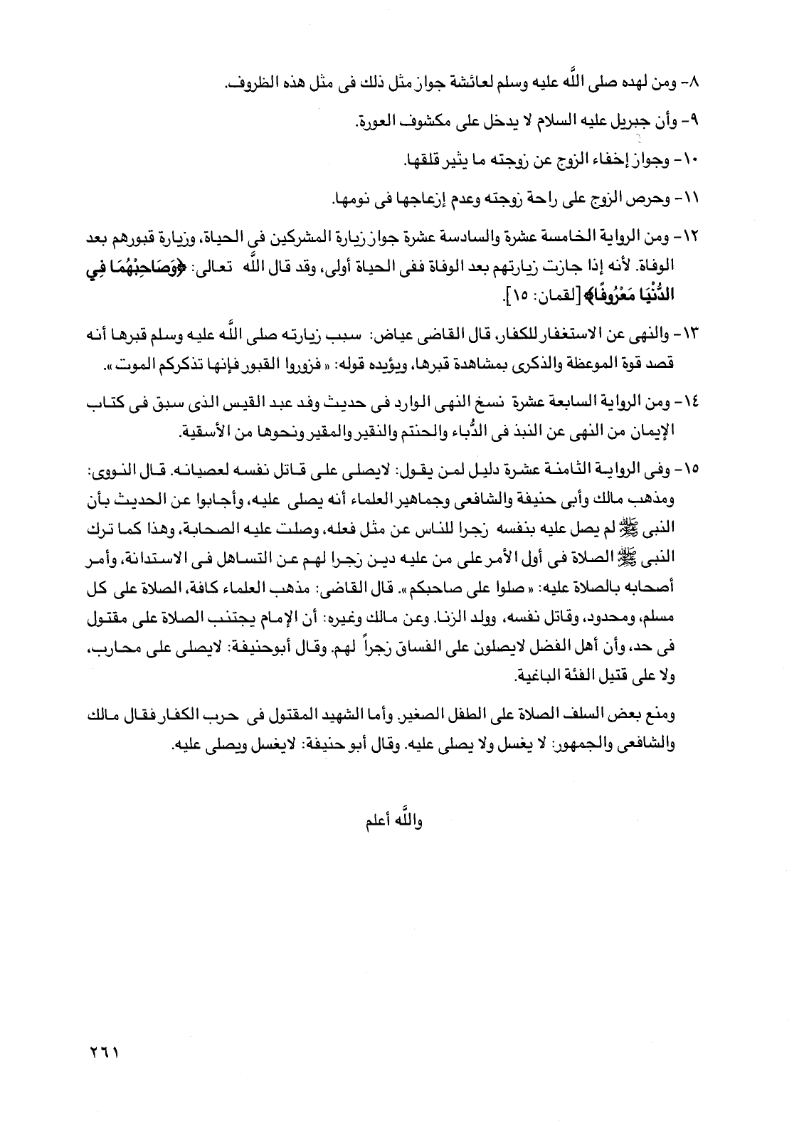 12 - ومن الرواية الخامسة عشرة والسادسة عشرة جواز زيارة المشركين في الحياة، وزيارة قبورهم بعد الوفاة. لأنه إذا جازت زيارتهم بعد الوفاة ففي الحياة أولى، وقد قال الله تعالى: {وصاحبهما في الدنيا معروفاً} [لقمان: 15].