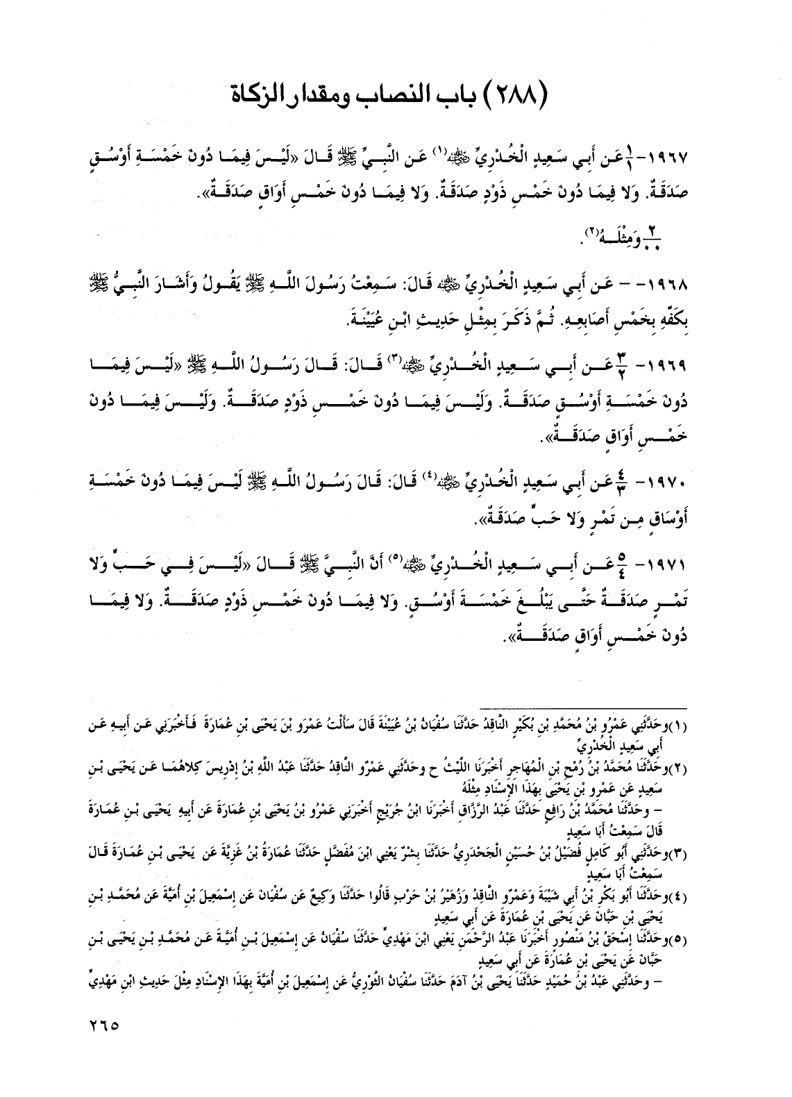 1969 - عن أبي سعيد الخدري رضي الله عنه قال: قال رسول الله صلى الله عليه وسلم "ليس فيما دون خمسة أوسق صدقة. وليس فيما دون خمس ذود صدقة. وليس فيما دون خمس أواق صدقة".
