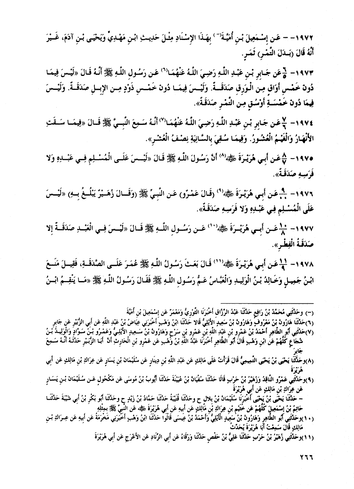 1973 - عن جابر بن عبد الله رضي الله عنهما عن رسول الله صلى الله عليه وسلم أنه قال "ليس فيما دون خمس أواق من الورق صدقة وليس فيما دون خمس ذود من الإبل صدقة. وليس فيما دون خمسة أوسق من التمر صدقة".