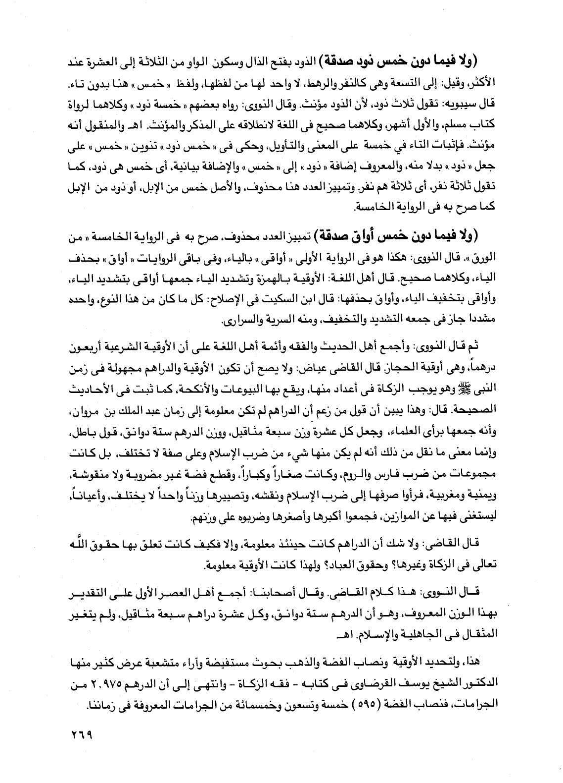 هذا، ولتحديد الأوقية ونصاب الفضة والذهب بحوث مستفيضة وآراء متشعبة عرض كثير منها الدكتور الشيخ يوسف القرضاوي في كتابه -فقه الزكاة- وانتهى إلى أن الدرهم 2.975 من الجرامات، فنصاب الفضة (595) خمسة وتسعون وخمسمائة من الجرامات المعروفة في زماننا.
