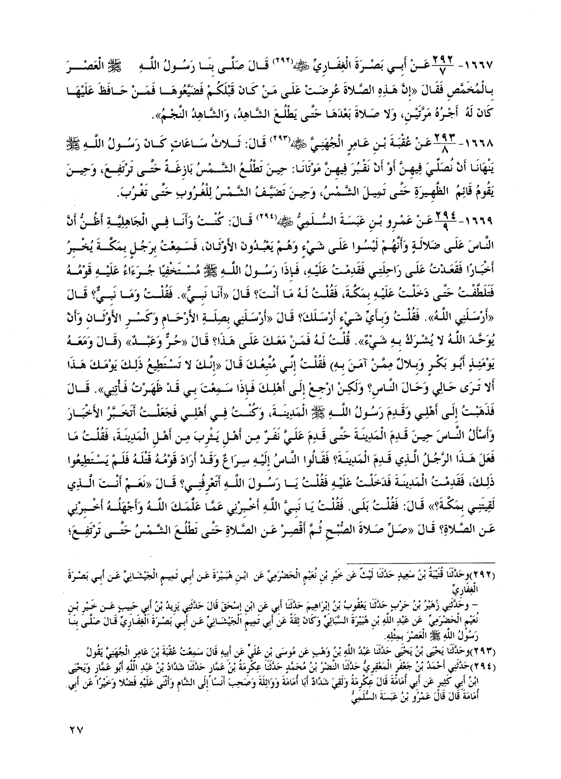 1667 - عن أبي بصرة الغفاري رضي الله عنه قال صلى بنا رسول الله صلى الله عليه وسلم العصر بالمخمص فقال "إن هذه الصلاة عرضت على من كان قبلكم فضيعوها فمن حافظ عليها كان له أجره مرتين، ولا صلاة بعدها حتى يطلع الشاهد، والشاهد النجم".