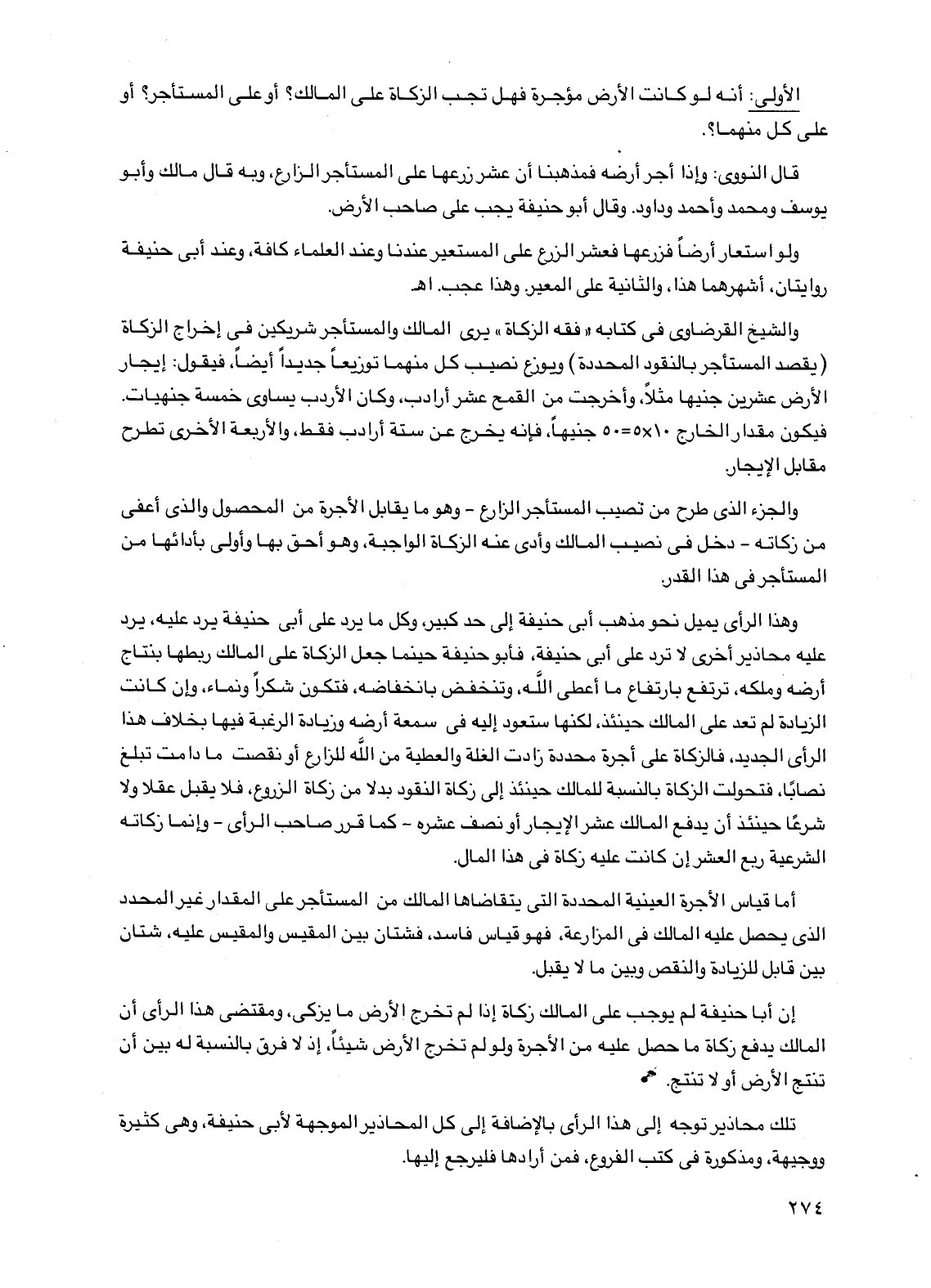 والشيخ القرضاوي في كتابه "فقه الزكاة" يرى المالك والمستأجر شريكين في إخراج الزكاة (يقصد المستأجر بالنقود المحددة) ويوزع نصيب كل منهما توزيعاً جديداً أيضاً، فيقول: إيجار الأرض عشرين جنيهاً مثلاً، وأخرجت من القمح عشر أرادب، وكان الأردب يساوي خمسة جنيهات. فيكون مقدار الخارج 10×5= 50 جنيهاً، فإنه يخرج عن ستة أرادب فقط، والأربعة الأخرى تطرح مقابل الإيجار.