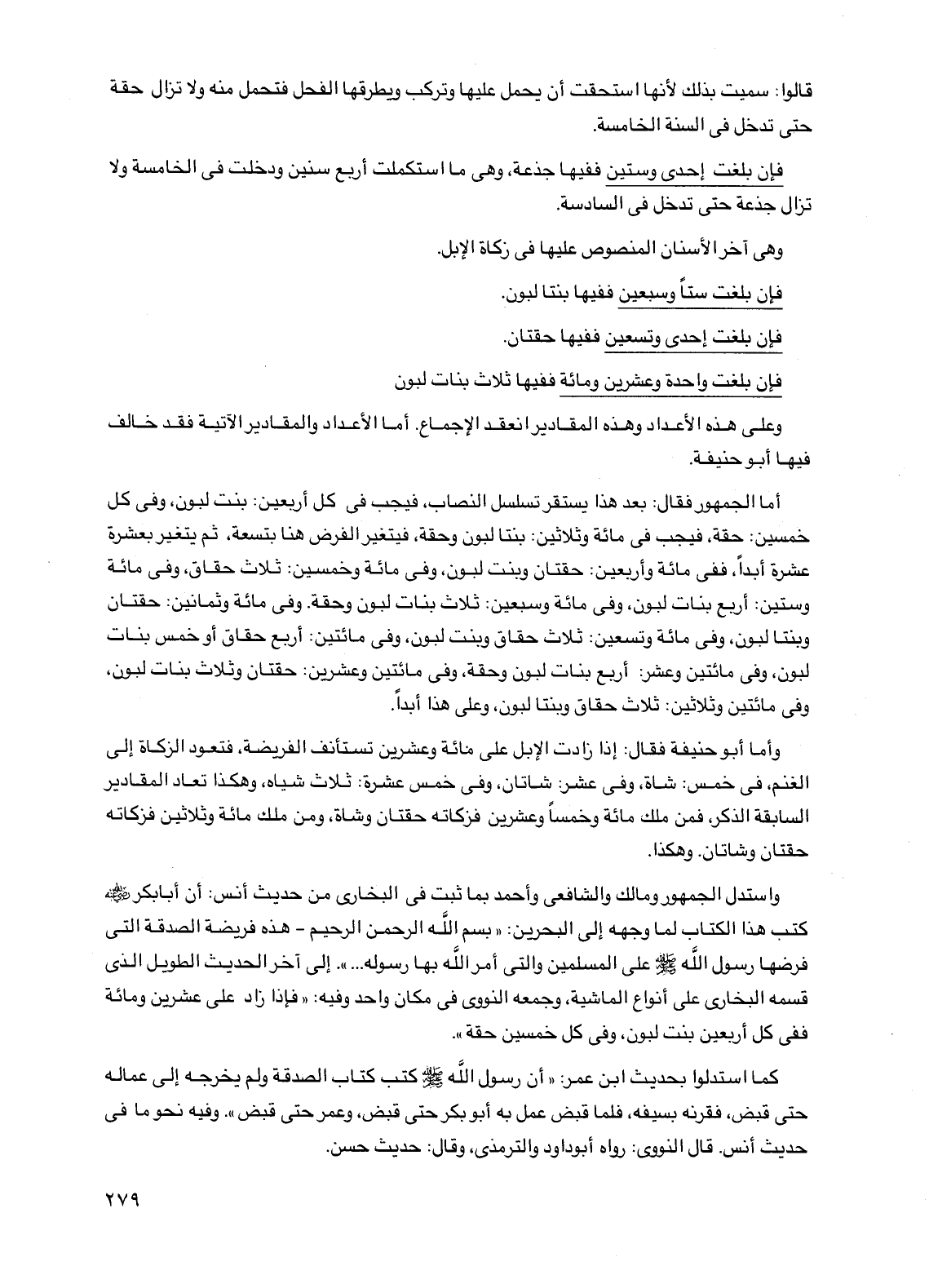 واستدل الجمهور ومالك والشافعي وأحمد بما ثبت في البخاري من حديث أنس: أن أبا بكر رضي الله عنه كتب هذا الكتاب لما وجهه إلى البحرين: "بسم الله الرحمن الرحيم -هذه فريضة الصدقة التي فرضها رسول الله صلى الله عليه وسلم على المسلمين والتي أمر الله بها رسوله ... ". إلى آخر الحديث الطويل الذي قسمه البخاري على أنواع الماشية، وجمعه النووي في مكان واحد وفيه: "فإذا زاد على عشرين ومائة ففي كل أربعين بنت لبون، وفي كل خمسين حقة".