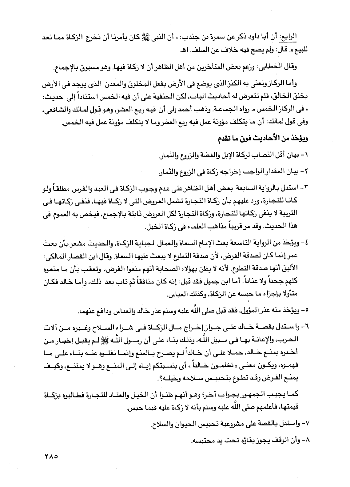 الرابع: أن أبا داود ذكر عن سمرة بن جندب: "أن النبي صلى الله عليه وسلم كان يأمرنا أن نخرج الزكاة مما نعد للبيع". قال: ولم يصح فيه خلاف عن السلف. اهـ.