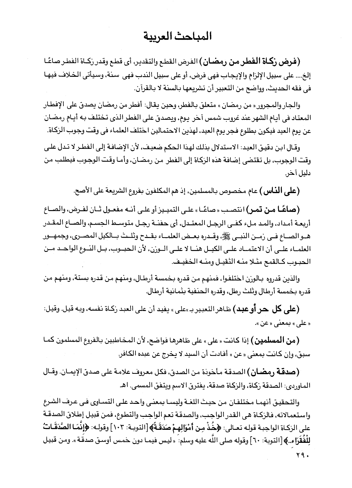 (صاعاً من تمر) انتصب "صاعاً" على التمييز أو على أنه مفعول ثان لفرض، والصاع أربعة أمداد، والمد ملء كفى الرجل المعتدل، أي حفنة رجل متوسط الجسم والصاع المقدر هو الصاع في زمن النبي صلى الله عليه وسلم، وقدره بعض العلماء بقدح وثلث بالكيل المصري، وجمهور العلماء على أن الاعتماد على الكيل هنا لا على الوزن، لأن الحبوب، بل النوع الواحد من الحبوب كالقمح مثلاً منه الثقيل ومنه الخفيف.