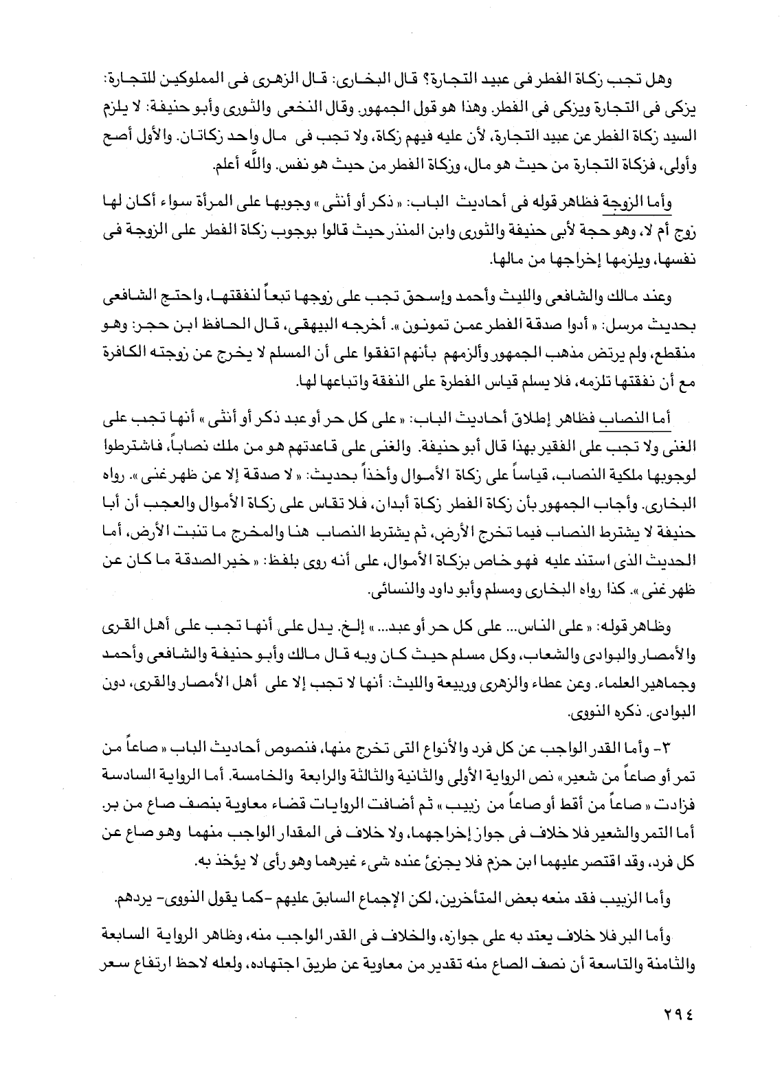 3 - وأما القدر الواجب عن كل فرد والأنواع التي تخرج منها، فنصوص أحاديث الباب "صاعاً من تمر أو صاعاً من شعير" نص الرواية الأولى والثانية والثالثة والرابعة والخامسة. أما الرواية السادسة فزادت "صاعاً من أقط أو صاعاً من زبيب" ثم أضافت الروايات قضاء معاوية بنصف صاع من بر. أما التمر والشعير فلا خلاف في جواز إخراجهما، ولا خلاف في المقدار الواجب منهما وهو صاع عن كل فرد، وقد اقتصر عليهما ابن حزم فلا يجزئ عنده شيء غيرهما وهو رأي لا يؤخذ به.