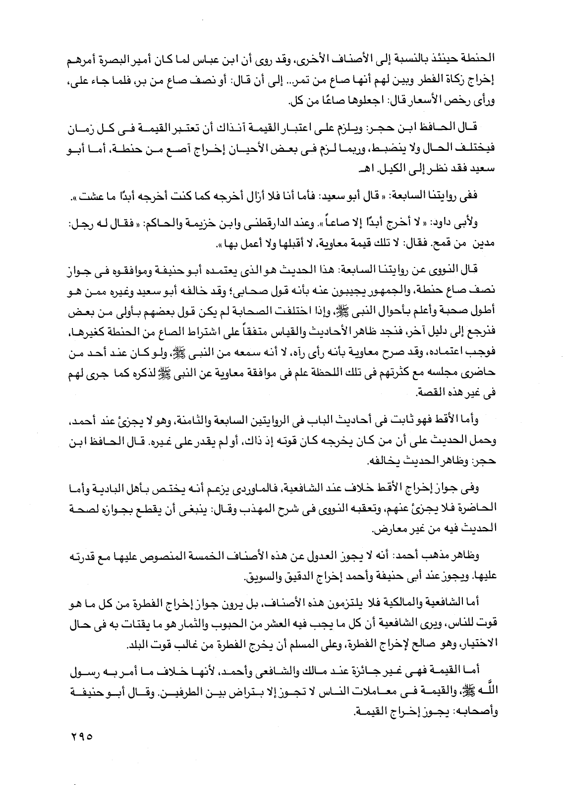 قال الحافظ ابن حجر: ويلزم على اعتبار القيمة آنذاك أن تعتبر القيمة في كل زمان فيختلف الحال ولا ينضبط، وربما لزم في بعض الأحيان إخراج آصع من حنطة، أما أبو سعيد فقد نظر إلى الكيل. اهـ.