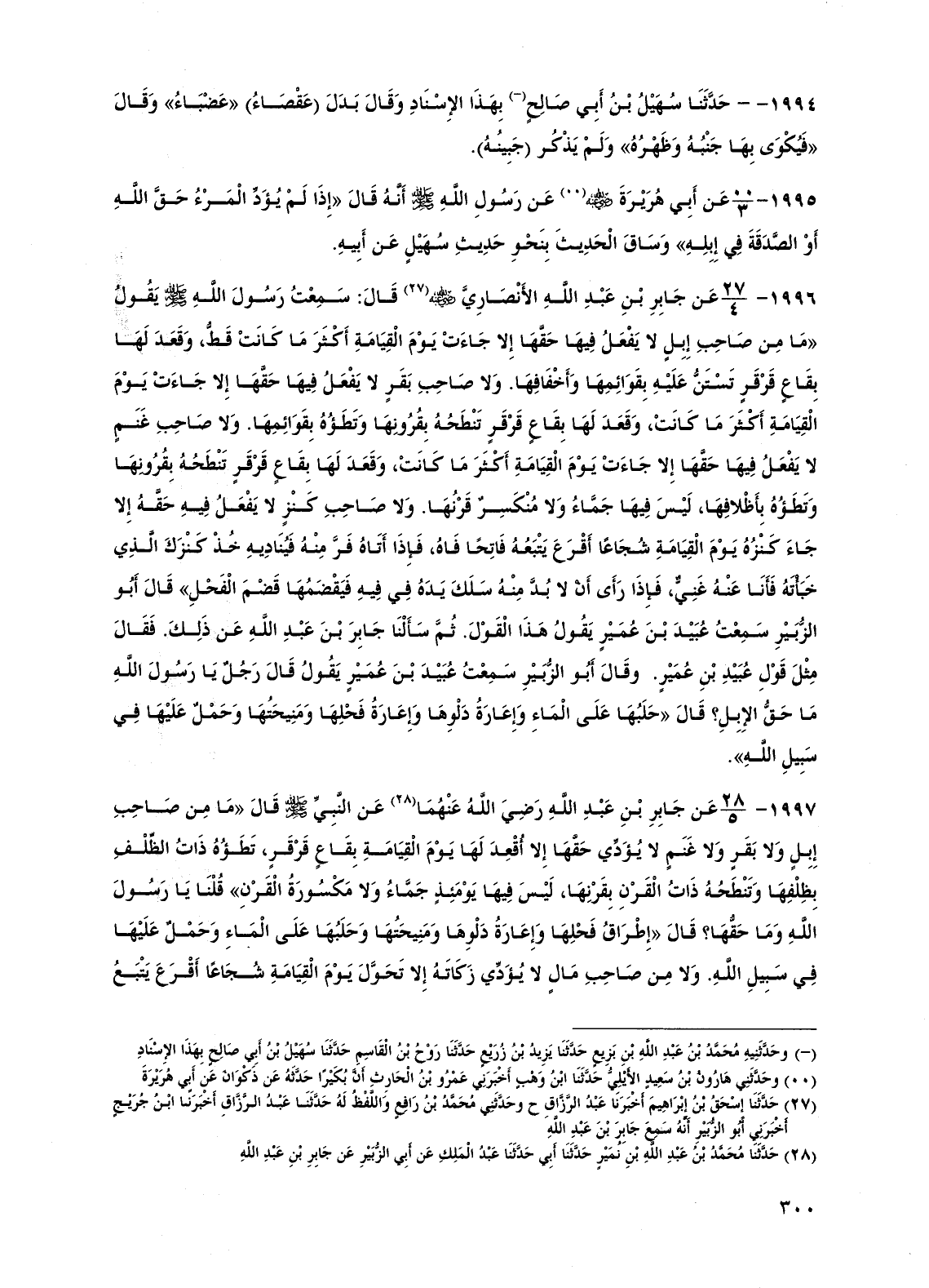 1994 - حدثنا سهيل بن أبي صالح بهذا الإسناد وقال بدل (عقصاء) "عضباء" وقال "فيكوى بها جنبه وظهره" ولم يذكر (جبينه).