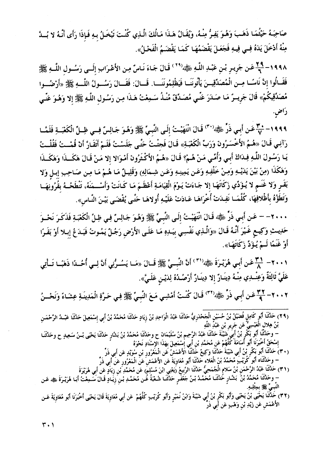 1999 - عن أبي ذر رضي الله عنه قال انتهيت إلى النبي صلى الله عليه وسلم وهو جالس في ظل الكعبة فلما رآني قال "هم الأخسرون ورب الكعبة" قال فجئت حتى جلست فلم أتقار أن قمت فقلت يا رسول الله فداك أبي وأمي من هم؟ قال "هم الأكثرون أموالاً إلا من قال هكذا وهكذا وهكذا (من بين يديه ومن خلفه وعن يمينه وعن شماله) وقليل ما هم ما من صاحب إبل ولا بقر ولا غنم لا يؤدي زكاتها إلا جاءت يوم القيامة أعظم ما كانت وأسمنه، تنطحه بقرونها وتطؤه بأظلافها، كلما نفدت أخراها عادت عليه أولاها حتى يقضى بين الناس".