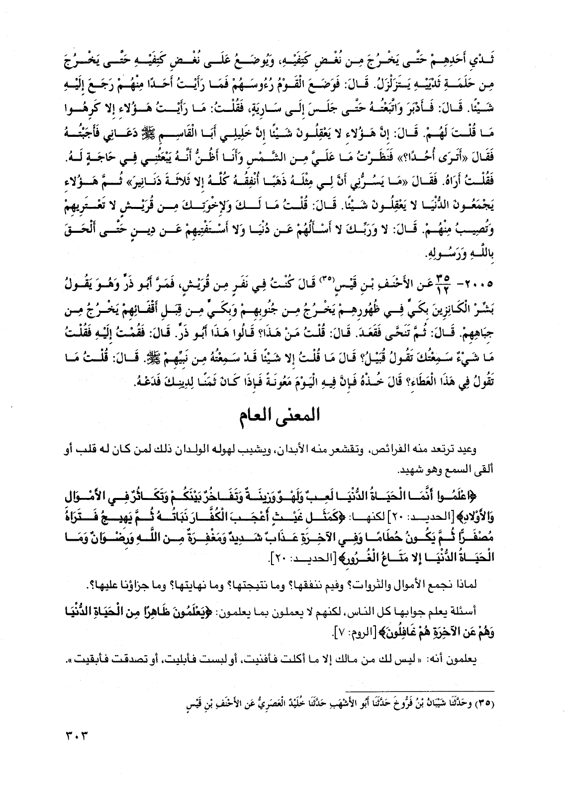 2005 - عن الأحنف بن قيس قال كنت في نفر من قريش، فمر أبو ذر وهو يقول بشر الكانزين بكي في ظهورهم يخرج من جنوبهم وبكي من قبل أقفائهم يخرج من جباههم. قال: ثم تنحى فقعد. قال: قلت من هذا؟ قالوا هذا أبو ذر. قال: فقمت إليه فقلت ما شيء سمعتك تقول قبيل؟ قال ما قلت إلا شيئاً قد سمعته من نبيهم صلى الله عليه وسلم. قال: قلت ما تقول في هذا العطاء؟ قال خذه فإن فيه اليوم معونة فإذا كان ثمناً لدينك فدعه.