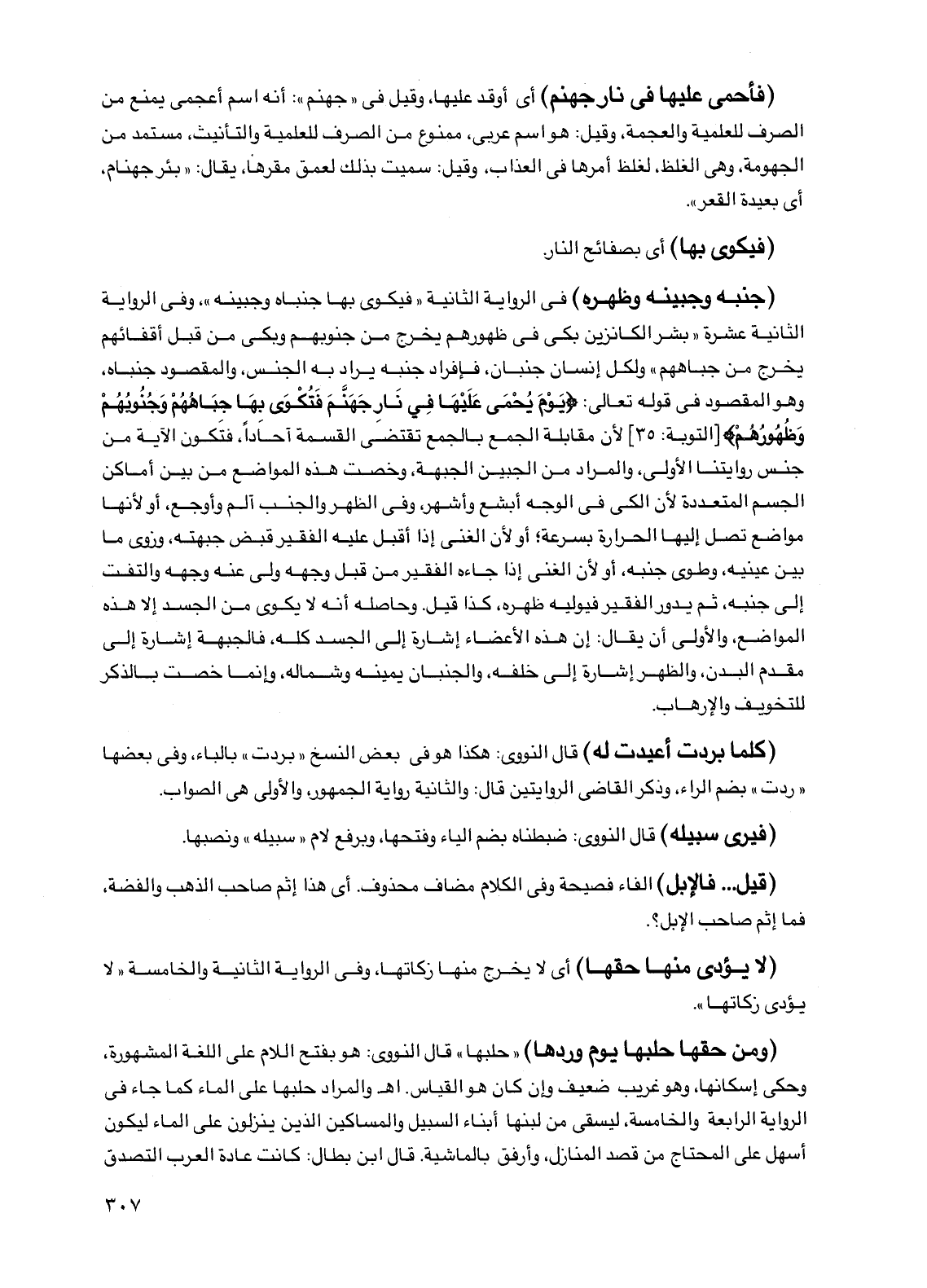 (فأحمي عليها في نار جهنم) أي أوقد عليها، وقيل في "جهنم": أنه اسم أعجمي يمنع من الصرف للعلمية والعجمة، وقيل: هو اسم عربي، ممنوع من الصرف للعلمية والتأنيث، مستمد من الجهومة، وهي الغلظ، لغلظ أمرها في العذاب، وقيل: سميت بذلك لعمق مقرها، يقال: "بئر جهنام، أي بعيدة القعر".
