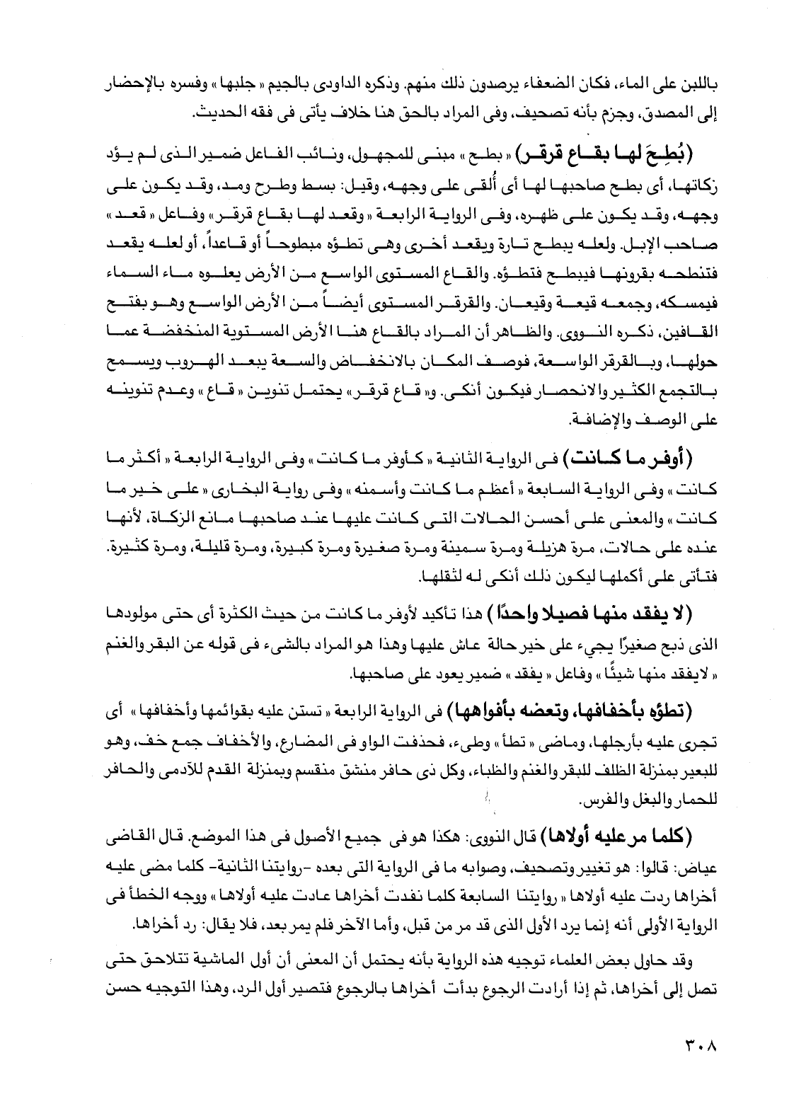 (بطح لها بقاع قرقر) "بطح" مبني للمجهول، ونائب الفاعل ضمير الذي لم يؤد زكاتها، أي بطح صاحبها لها أي ألقي على وجهه، وقيل: بسط وطرح ومد، وقد يكون على وجهه، وقد يكون على ظهره، وفي الرواية الرابعة "وقعد بها بقاع قرقر" وفاعل "قعد" صاحب الإبل. ولعله يبطح تارة ويقعد أخرى وهي تطؤه مبطوحاً أو قاعداً، أو لعله يقعد فتنطحه بقرونها فيبطح فتطؤه. والقاع المستوي الواسع من الأرض يعلوه ماء السماء فيمسكه، وجمعه قيعة وقيعان. والقرقر المستوي أيضاً من الأرض الواسع وهو بفتح القافين، ذكره النووي. والظاهر أن المراد بالقاع هنا الأرض المستوية المنخفضة عما حولها، وبالقرقر الواسعة، فوصف المكان بالانخفاض والسعة يبعد الهروب ويسمح بالتجمع الكثير والانحصار فيكون أنكى. و"قاع قرقر" يحتمل تنوين "قاع" وعدم تنوينه على الوصف والإضافة.