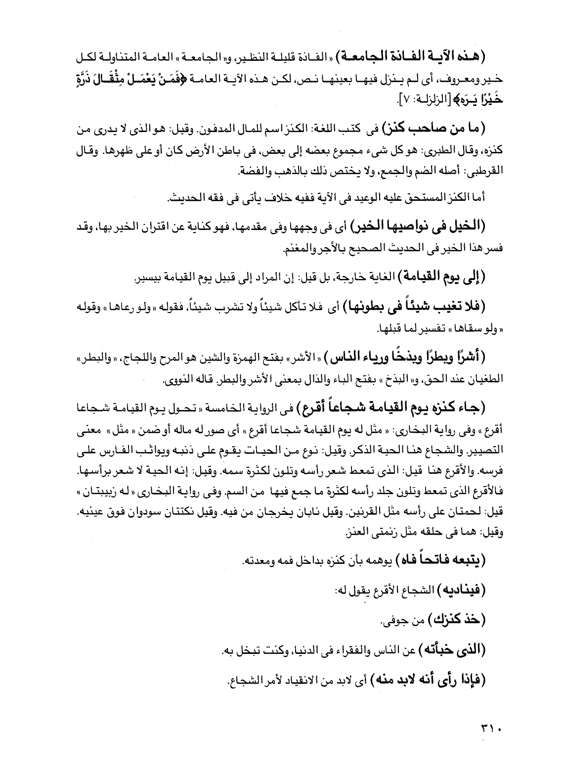 (جاء كنزه يوم القيامة شجاعاً أقرع) في الرواية الخامسة "تحول يوم القيامة شجاعاً أقرع" وفي رواية البخاري: "مثل له يوم القيامة شجاعاً أقرع" أي صور له ماله أو ضمن "مثل" معنى التصيير. والشجاع هنا الحية الذكر. وقيل: نوع من الحيات يقوم على ذنبه ويواثب الفارس على فرسه. والأقرع هنا قيل: الذي تمعط شعر رأسه وتلون لكثرة سمه. وقيل: إنه الحية لا شعر برأسها. فالأقرع الذي تمعط وتلون جلد رأسه لكثرة ما جمع فيها من السم. وفي رواية البخاري "له زبيبتان" قيل: لحمتان على رأسه مثل القرنين. وقيل نابان يخرجان من فيه. وقيل نكتتان سودوان فوق عينيه. وقيل: هما في حلقه مثل زنمتي العنز.