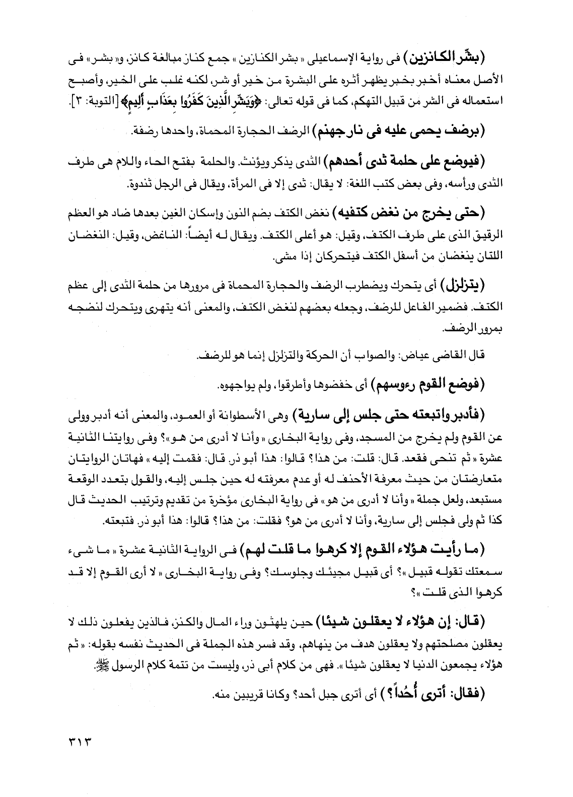 (بشر الكانزين) في رواية الإسماعيلي "بشر الكنازين" جمع كناز مبالغة كانز، و"بشر" في الأصل معناه أخبر بخبر يظهر أثره على البشرة من خير أو شر، لكنه غلب على الخير، وأصبح استعماله في الشر من قبيل التهكم، كما في قوله تعالى: {وبشر الذين كفروا بعذاب أليم} [التوبة: 3].