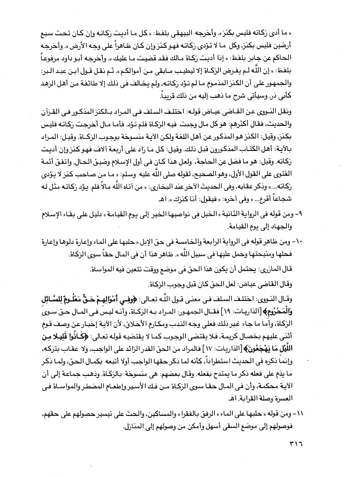 "ما أدي زكاته فليس بكنز". وأخرجه البيهقي بلفظ: "كل ما أديت زكاته وإن كان تحت سبع أرضين فليس بكنز، وكل ما لا تؤدى زكاته فهو كنز وإن كان ظاهراً على وجه الأرض". وأخرجه الحاكم عن جابر بلفظ: "إذا أديت زكاة مالك فقد قضيت ما عليك". وأخرجه أبو داود مرفوعاً بلفظ: "إن الله لم يفرض الزكاة إلا ليطيب ما بقي من أموالكم". ثم نقل قول ابن عبد البر: والجمهور على أن الكنز المذموم ما لم تؤد زكاته، ولم يخالف في ذلك إلا طائفة من أهل الزهد كأبي ذر. وسيأتي شرح ما ذهب إليه من ذلك قريباً.