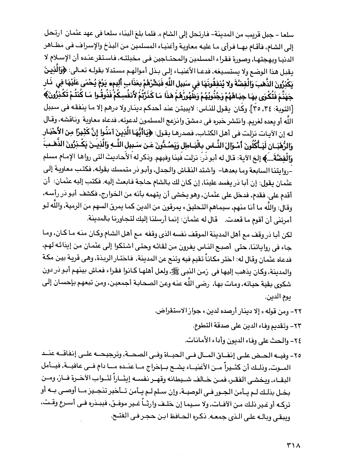 سلعاً -جبل قريب من المدينة- فارتحل إلى الشام". فلما بلغ البناء سلعاً في عهد عثمان ارتحل إلى الشام، فأقام بها فرأى ما عليه معاوية وأغنياء المسلمين من البذخ والإسراف في مظاهر الدنيا وبهجتها، وصورة فقراء المسلمين والمحتاجين في مخيلته، فاستقر عنده أن الإسلام لا يقبل هذا الوضع ولا يستسيغه، فدعا الأغنياء إلى بذل أموالهم مستدلاً بقوله تعالى: {والذين يكنزون الذهب والفضة ولا ينفقونها في سبيل الله فبشرهم بعذاب أليم يوم يحمى عليها في نار جهنم فتكوى بها جباههم وجنوبهم وظهورهم هذا ما كنزتم لأنفسكم فذوقوا ما كنتم تكنزون} [التوبة: 34، 35]. وكان يقول للناس: لا يبيتن عند أحدكم دينار ولا درهم إلا ما ينفقه في سبيل الله أو يعده لغريم. وانتشر خبره في دمشق وانزعج المسلمون لدعوته، فدعاه معاوية وناقشه، وقال له إن الآيات نزلت في أهل الكتاب، فصدرها يقول: {يا أيها الذين آمنوا إن كثيراً من الأحبار والرهبان ليأكلون أموال الناس بالباطل ويصدون عن سبيل الله والذين يكنزون الذهب والفضة .... } إلخ الآية: قال له أبو ذر: نزلت فينا وفيهم. وذكر له الأحاديث التي رواها الإمام مسلم -روايتنا السابعة وما بعدها- واشتد النقاش والجدل، وأبو ذر متمسك بقوله، فكتب معاوية إلى عثمان يقول: إن أبا ذر يفسد علينا، إن كان لك بالشام حاجة فابعث إليه. فكتب إليه عثمان: أن أقدم علي. فقدم، فدخل على عثمان، وهو يخشى أن يتهمه بأنه من الخوارج، فكشف أبو ذر رأسه، وقال: والله ما أنا منهم، سيماهم التحليق" يمرقون من الدين كما يمرق السهم من الرمية، والله لو أمرتني أن أقوم ما قعدت. قال له عثمان: إنما أرسلنا إليك لتجاورنا بالمدينة.
