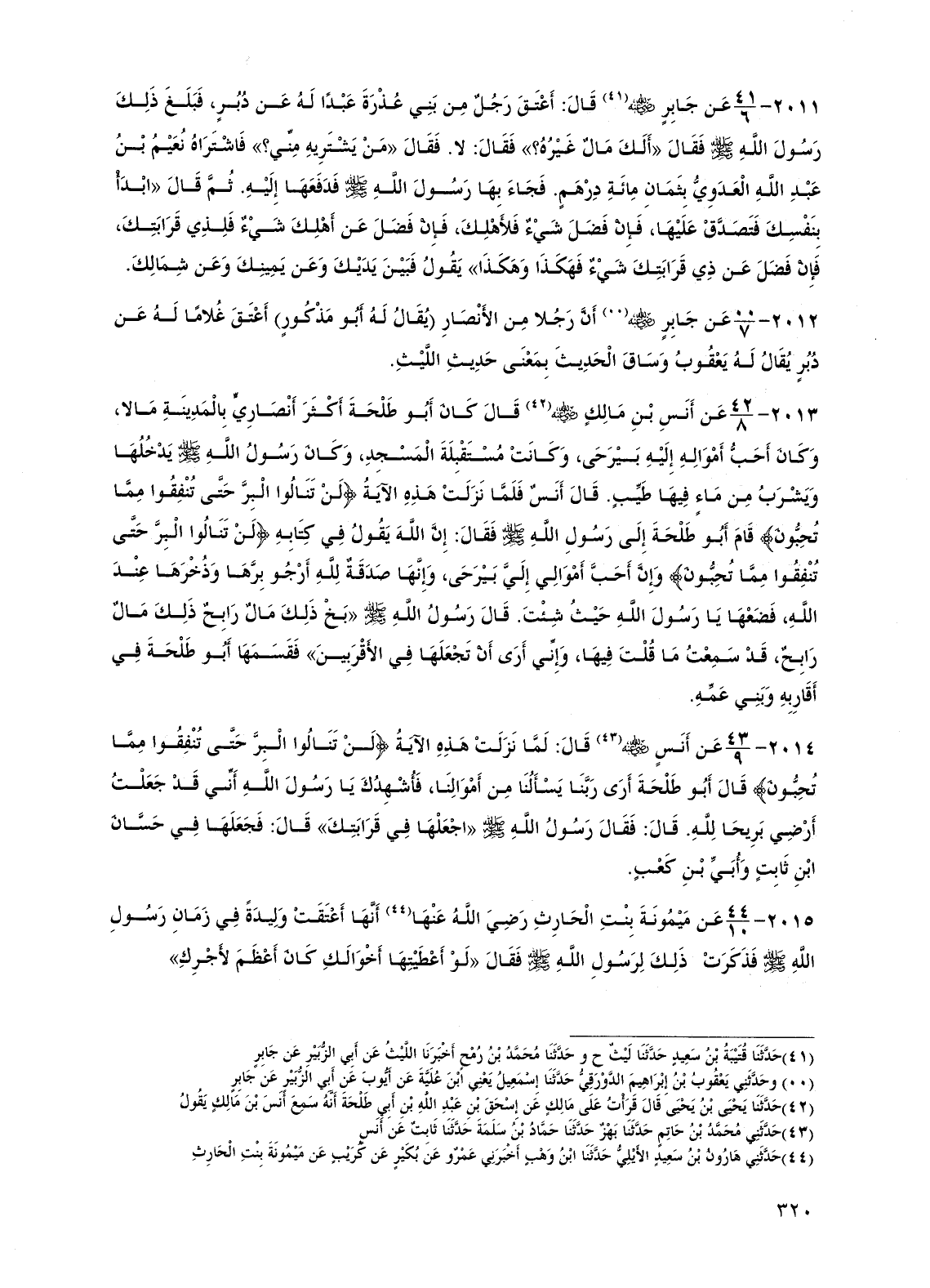2014 - عن أنس رضي الله عنه قال: لما نزلت هذه الآية {لن تنالوا البر حتى تنفقوا مما تحبون} قال أبو طلحة أرى ربنا يسألنا من أموالنا، فأشهدك يا رسول الله أني قد جعلت أرضي بريحا لله. قال: فقال رسول الله صلى الله عليه وسلم "اجعلها في قرابتك" قال: فجعلها في حسان بن ثابت وأبي بن كعب.