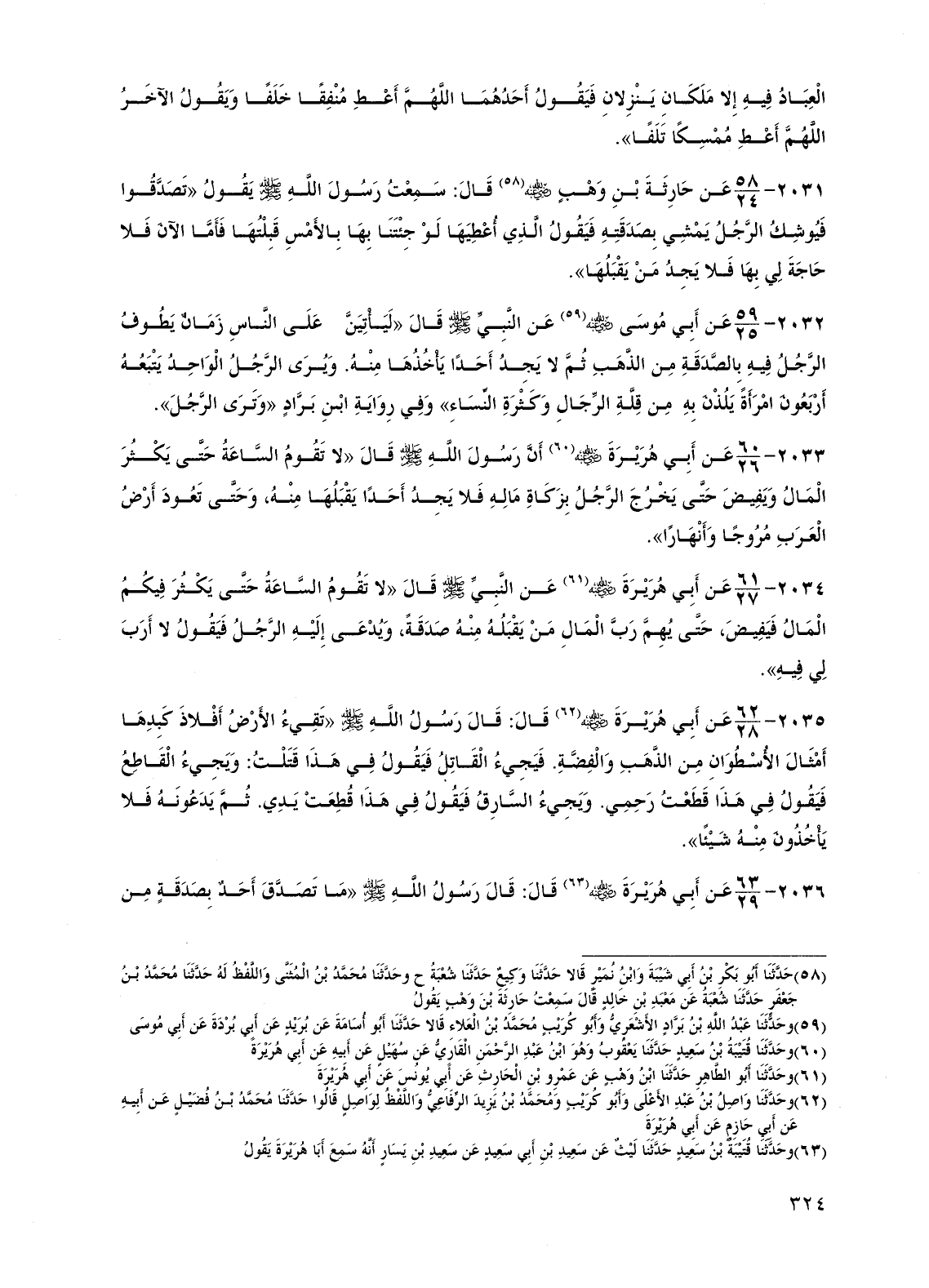 2033 - عن أبي هريرة رضي الله عنه أن رسول الله صلى الله عليه وسلم قال "لا تقوم الساعة حتى يكثر المال ويفيض حتى يخرج الرجل بزكاة ماله فلا يجد أحداً يقبلها منه، وحتى تعود أرض العرب مروجاً وأنهاراً".
