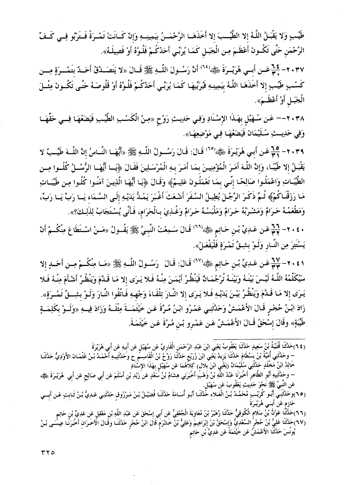 2037 - عن أبي هريرة رضي الله عنه أن رسول الله صلى الله عليه وسلم قال "لا يتصدق أحد بتمرة من كسب طيب إلا أخذها الله بيمينه فيربيها كما يربي أحدكم فلوه أو قلوصه حتى تكون مثل الجبل أو أعظم".