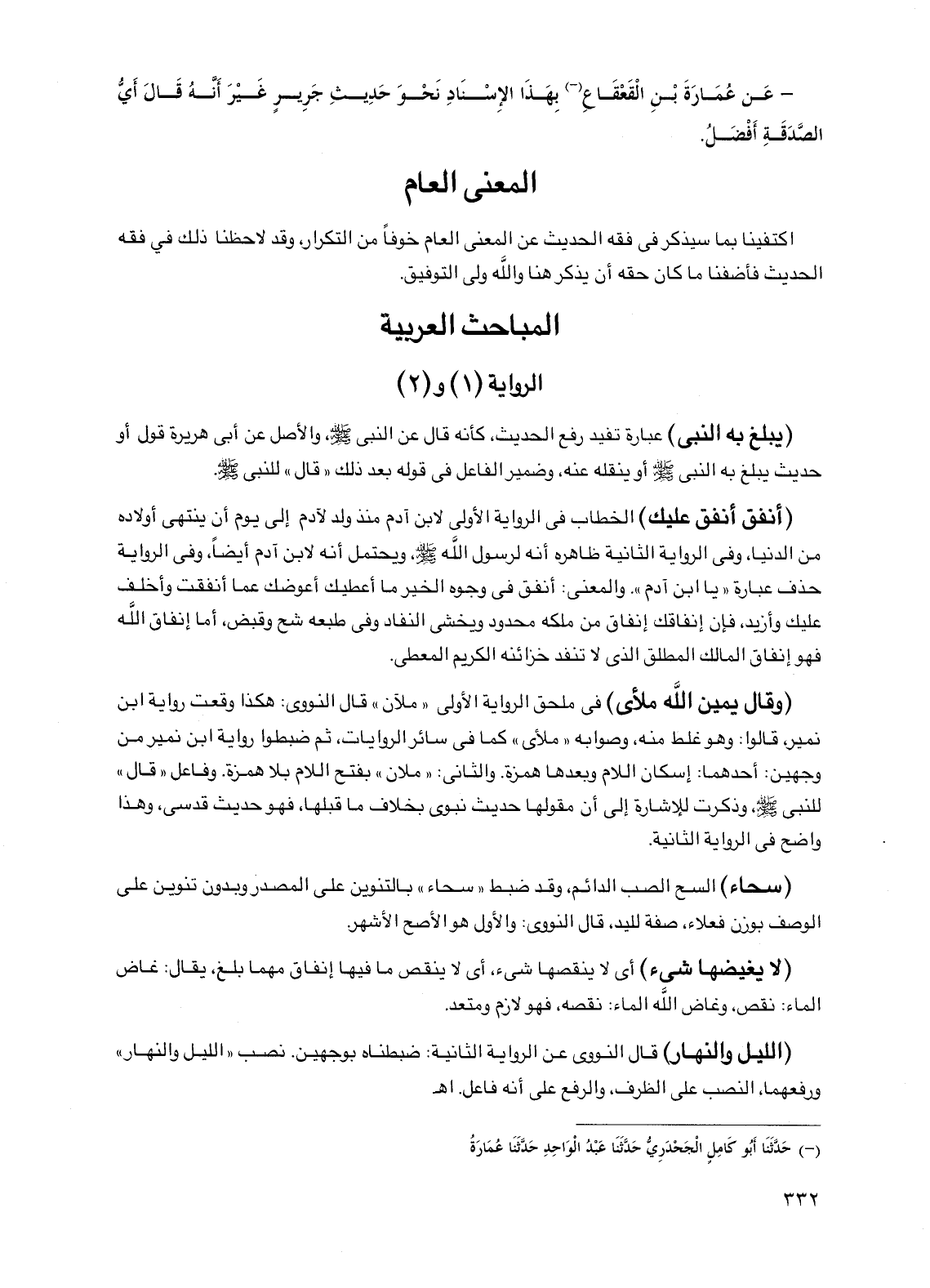 (أنفق أنفق عليك) الخطاب في الرواية الأولى لابن آدم منذ ولد لآدم إلى يوم أن ينتهي أولاده من الدنيا، وفي الرواية الثانية ظاهره أنه لرسول الله صلى الله عليه وسلم، ويحتمل أنه لابن آدم أيضاً، وفي الرواية حذف عبارة "يا ابن آدم". والمعنى: أنفق في وجوه الخير ما أعطيك أعوضك عما أنفقت وأخلف عليك وأزيد، فإن إنفاقك إنفاق من ملكه محدود ويخشى النفاد وفي طبعه شح وقبض، أما إنفاق الله فهو إنفاق المالك المطلق الذي لا تنفد خزائنه الكريم المعطى.