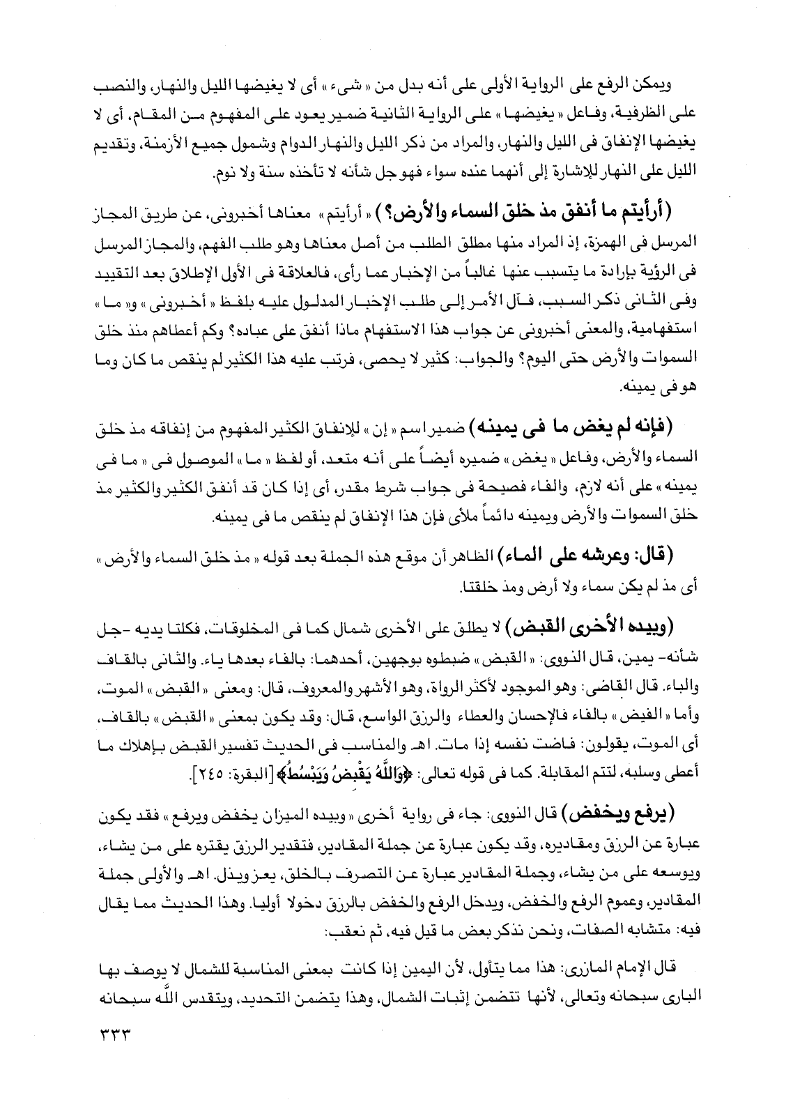 (أرأيتم ما أنفق مذ خلق السماء والأرض؟ ) "أرأيتم" معناها أخبروني، عن طريق المجاز المرسل في الهمزة، إذ المراد منها مطلق الطلب من أصل معناها وهو طلب الفهم، والمجاز المرسل في الرؤية بإرادة ما يتسبب عنها غالباً من الإخبار عما رأى، فالعلاقة في الأول الإطلاق بعد التقييد وفي الثاني ذكر السبب، فآل الأمر إلى طلب الإخبار المدلول عليه بلفظ "أخبروني" و"ما" استفهامية، والمعنى أخبروني عن جواب هذا الاستفهام ماذا أنفق على عباده؟ وكم أعطاهم منذ خلق السموات والأرض حتى اليوم؟ والجواب: كثير لا يحصى، فرتب عليه هذا الكثير لم ينقص ما كان وما هو في يمينه.