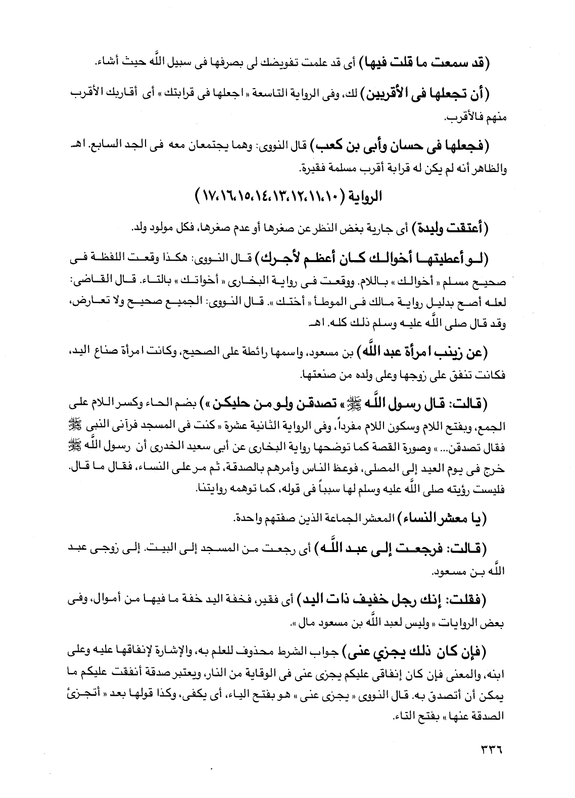 (قالت: قال رسول الله صلى الله عليه وسلم "تصدقن ولو من حليكن") بضم الحاء وكسر اللام على الجمع، وبفتح اللام وسكون اللام مفرداً، وفي الرواية الثانية عشرة "كنت في المسجد فرآني النبي صلى الله عليه وسلم فقال تصدقن .... " وصورة القصة كما توضحها رواية البخاري عن أبي سعيد الخدري أن رسول الله صلى الله عليه وسلم خرج في يوم العيد إلى المصلى، فوعظ الناس وأمرهم بالصدقة، ثم مر على النساء، فقال ما قال. فليست رؤيته صلى الله عليه وسلم لها سبباً في قوله، كما توهمه روايتنا.
