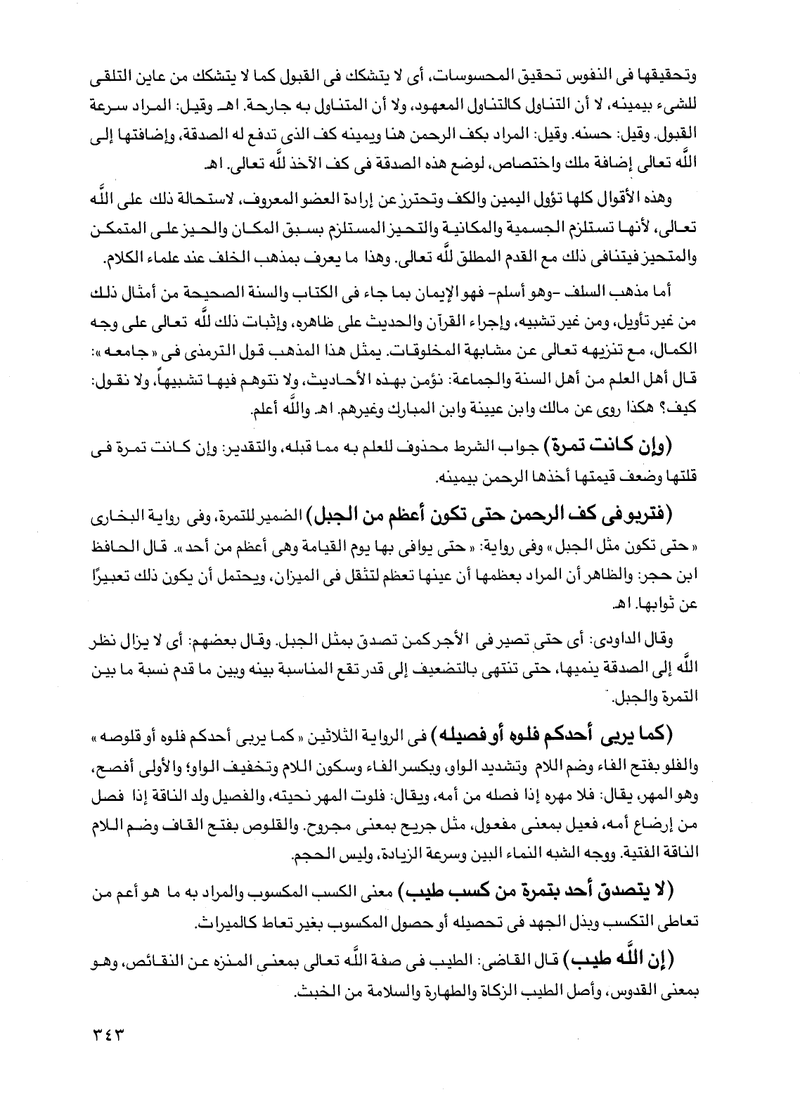 (فتربو في كف الرحمن حتى تكون أعظم من الجبل) الضمير للتمرة، وفي رواية البخاري "حتى تكون مثل الجبل" وفي رواية: "حتى يوافى بها يوم القيامة وهي أعظم من أحد". قال الحافظ ابن حجر: والظاهر أن المراد بعظمها أن عينها تعظم لتثقل في الميزان، ويحتمل أن يكون ذلك تعبيراً عن ثوابها. اهـ.