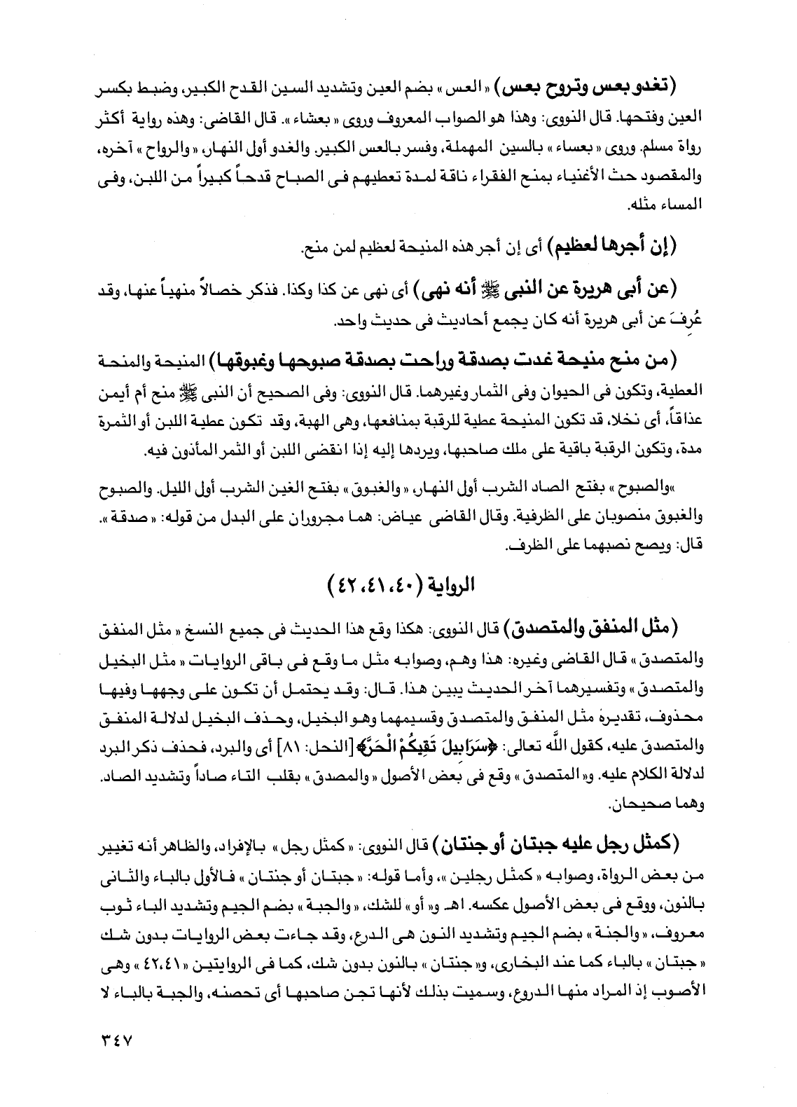 (تغدو بعس وتروح بعس) "العس" بضم العين وتشديد السين القدح الكبير، وضبط بكسر العين وفتحها. قال النووي: وهذا هو الصواب المعروف وروى "بعشاء". قال القاضي: وهذه رواية أكثر رواة مسلم. وروى "بعساء" بالسين المهملة، وفسر بالعس الكبير. والغدو أول النهار، و"الرواح" آخره، والمقصود حث الأغنياء بمنح الفقراء ناقة لمدة تعطيهم في الصباح قدحاً كبيراً من اللبن، وفي المساء مثله.
