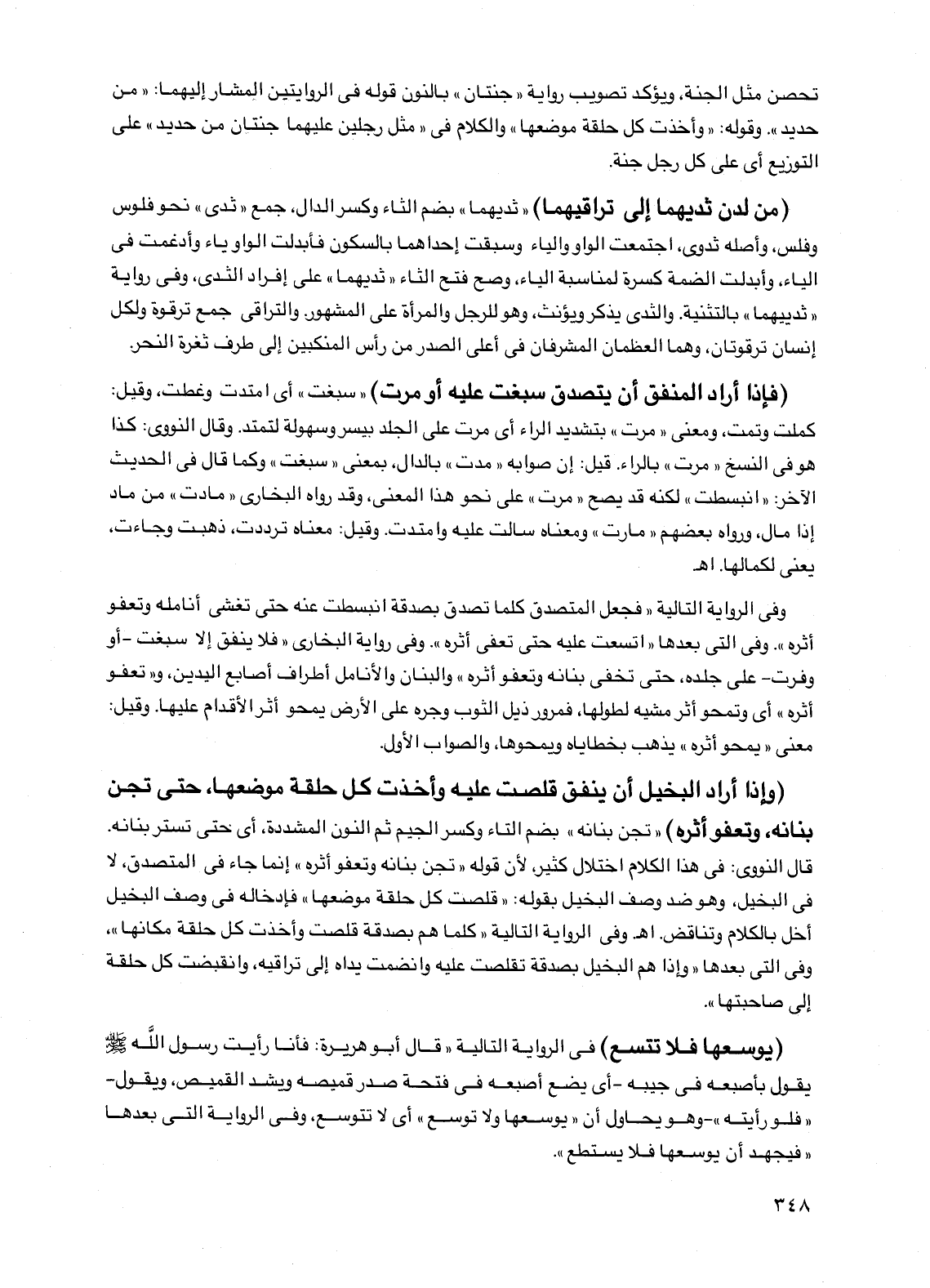 (وإذا أراد البخيل أن ينفق قلصت عليه وأخذت كل حلقة موضعها، حتى تجن بنانه، وتعفو أثره) "تجن بنانه" بضم التاء وكسر الجيم ثم النون المشددة، أي حتى تستر بنانه. قال النووي: في هذا الكلام اختلال كثير، لأن قوله "تجن بنانه وتعفو أثره" إنما جاء في المتصدق، لا في البخيل، وهو ضد وصف البخيل بقوله: "قلصت كل حلقة موضعها" فإدخاله في وصف البخيل أخل بالكلام وتناقض. اهـ وفي الرواية التالية "كلما هم بصدقة قلصت وأخذت كل حلقة مكانها"، وفي التي بعدها "وإذا هم البخيل بصدقة تقلصت عليه وانضمت يداه إلى تراقيه، وانقبضت كل حلقة إلى صاحبتها".