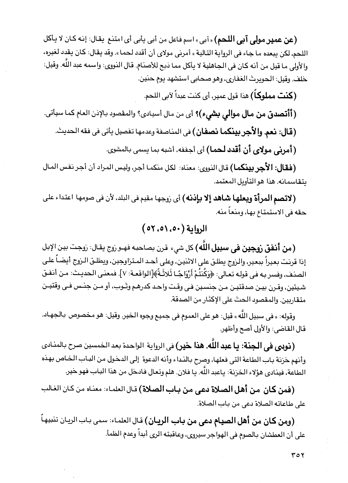 (عن عمير مولى آبي اللحم) "آبي" اسم فاعل من أبى يأبى أي امتنع يقال: إنه كان لا يأكل اللحم، لكن يبعده ما جاء في الرواية التالية "أمرني مولاي أن أقدد لحما". وقد يقال: كان يقدد لغيره، والأولى ما قيل من أنه كان في الجاهلية لا يأكل مما ذبح للأصنام. قال النووي: واسمه عبد الله. وقيل: خلف. وقيل: الحويرث الغفاري، وهو صحابي استشهد يوم حنين.