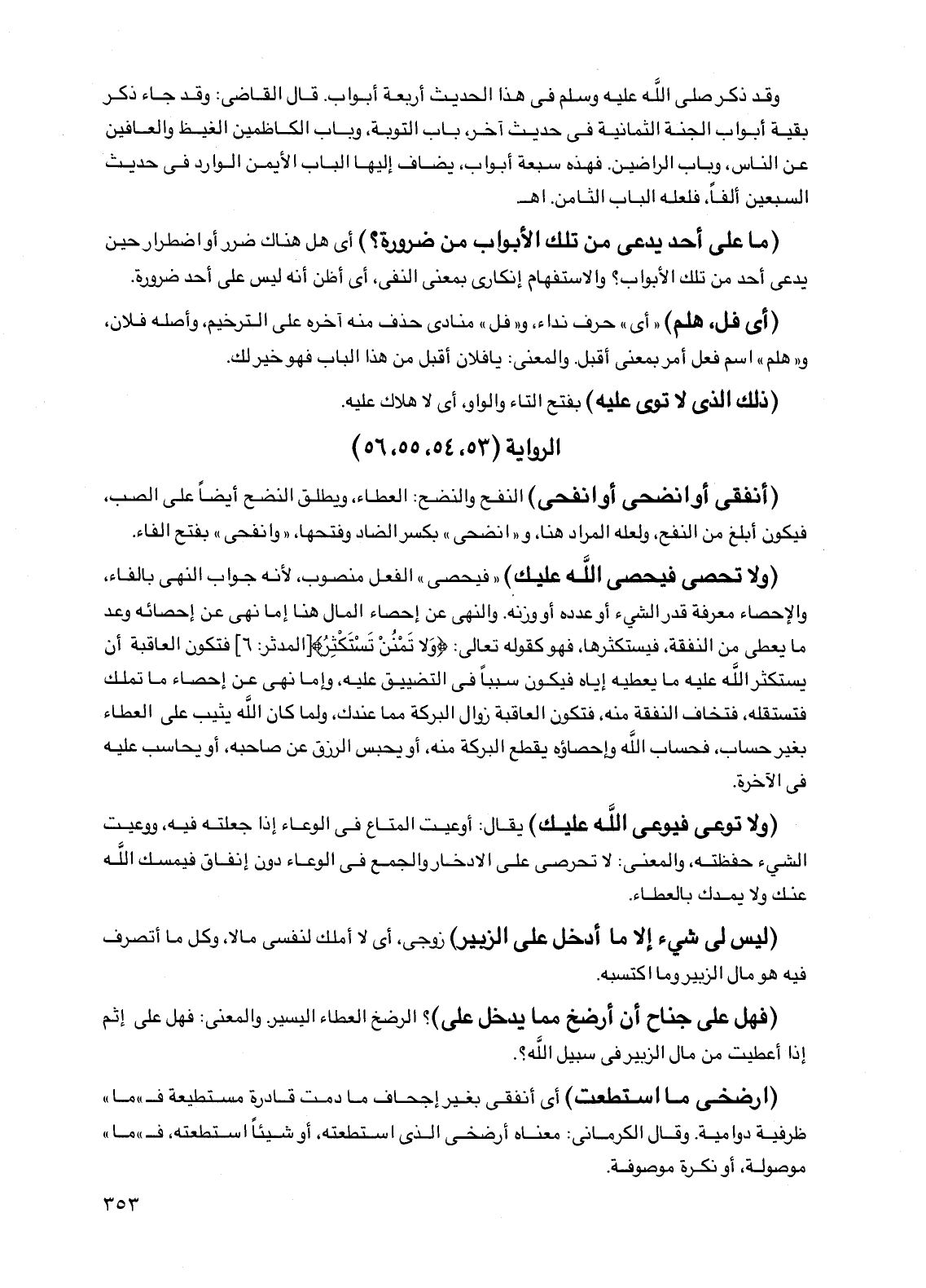 (ولا تحصي فيحصي الله عليك) "فيحصي" الفعل منصوب، لأنه جواب النهي بالفاء، والإحصاء معرفة قدر الشيء أو عدده أو وزنه. والنهي عن إحصاء المال هنا إما نهي عن إحصائه وعد ما يعطى من النفقة، فيستكثرها، فهو كقوله تعالى: {ولا تمنن تستكثر} [المدثر: 6] فتكون العاقبة أن يستكثر الله عليه ما يعطيه إياه فيكون سبباً في التضييق عليه، وإما نهي عن إحصاء ما تملك فتستقله، فتخاف النفقة منه، فتكون العاقبة زوال البركة مما عندك، ولما كان الله يثيب على العطاء بغير حساب، فحساب الله وإحصاؤه يقطع البركة منه، أو يحبس الرزق عن صاحبه، أو يحاسب عليه في الآخرة.
