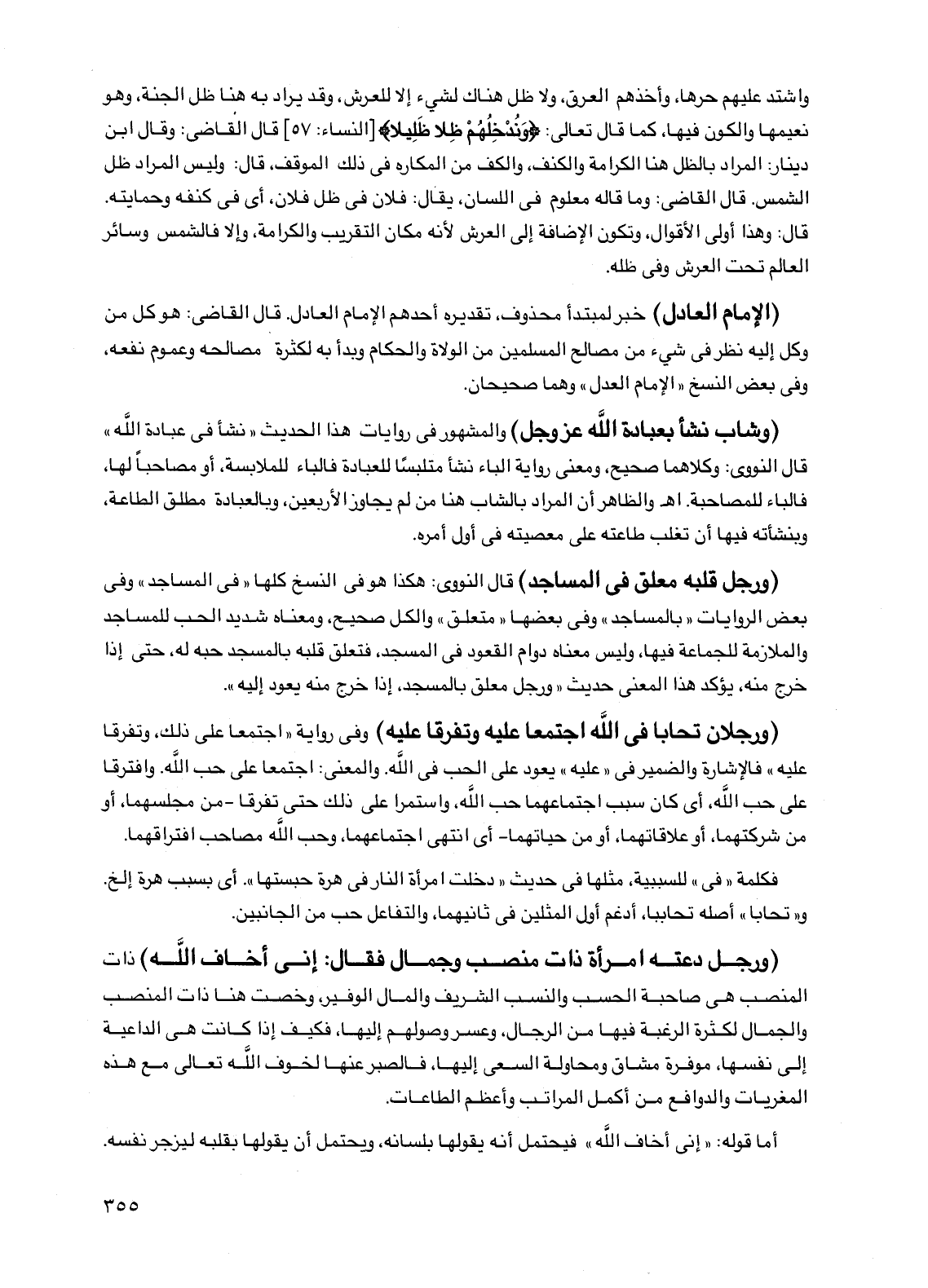 (ورجل قلبه معلق في المساجد) قال النووي: هكذا هو في النسخ كلها "في المساجد" وفي بعض الروايات "بالمساجد" وفي بعضها "متعلق" والكل صحيح، ومعناه شديد الحب للمساجد والملازمة للجماعة فيها، وليس معناه دوام القعود في المسجد، فتعلق قلبه بالمسجد حبه له، حتى إذا خرج منه، يؤكد هذا المعنى حديث "ورجل معلق بالمسجد، إذا خرج منه يعود إليه".