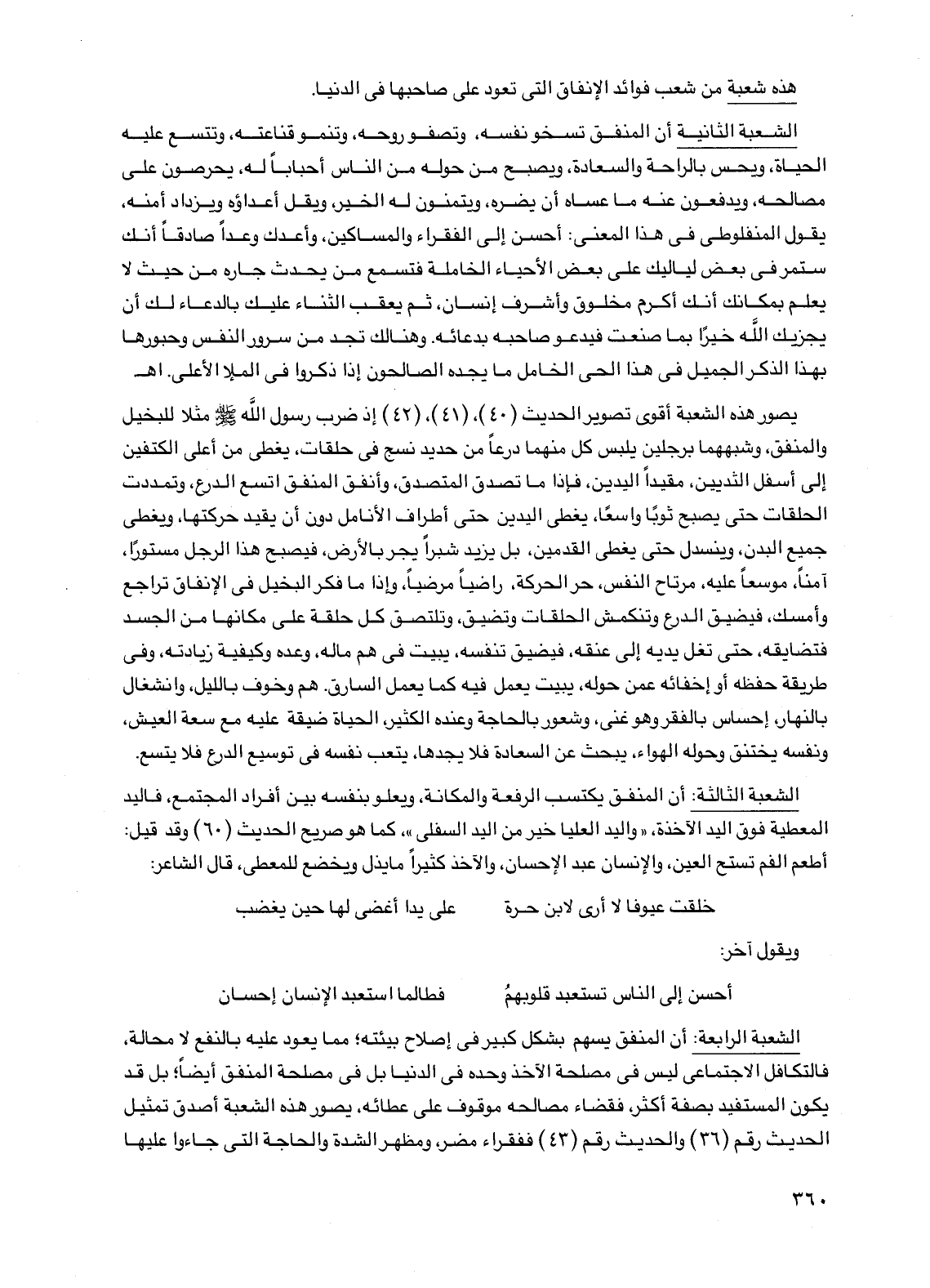 الشعبة الثانية أن المنفق تسخو نفسه، وتصفو روحه، وتنمو قناعته، وتتسع عليه الحياة، ويحس بالراحة والسعادة، ويصبح من حوله من الناس أحباباً له، يحرصون على مصالحه، ويدفعون عنه ما عساه أن يضره، ويتمنون له الخير، ويقل أعداؤه ويزداد أمنه، يقول المنفلوطي في هذا المعنى: أحسن إلى الفقراء والمساكين، وأعدك وعداً صادقاً أنك ستمر في بعض لياليك على بعض الأحياء الخاملة فتسمع من يحدث جاره من حيث لا يعلم بمكانك أنك أكرم مخلوق وأشرف إنسان، ثم يعقب الثناء عليك بالدعاء لك أن يجزيك الله خيراً بما صنعت فيدعو صاحبه بدعائه. وهنالك تجد من سرور النفس وحبورها بهذا الذكر الجميل في هذا الحي الخامل ما يجده الصالحون إذا ذكروا في الملإ الأعلى. اهـ.