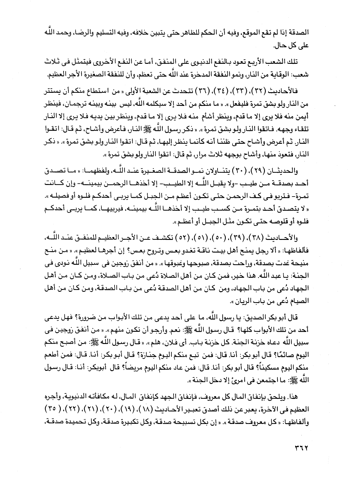 فالأحاديث (32)، (33)، (34)، (36) تتحدث عن الشعبة الأولى "من استطاع منكم أن يستتر من النار ولو بشق تمرة فليفعل". "ما منكم من أحد إلا سيكلمه الله، ليس بينه وبينه ترجمان، فينظر أيمن منه فلا يرى إلا ما قدم، وينظر أشأم منه فلا يرى إلا ما قدم، وينظر بين يديه فلا يرى إلا النار تلقاء وجهه. فاتقوا النار ولو بشق تمرة". "ذكر رسول الله صلى الله عليه وسلم النار، فأعرض وأشاح، ثم قال: اتقوا النار. ثم أعرض وأشاح حتى ظننا أنه كأنما ينظر إليها، ثم قال: اتقوا النار ولو بشق تمرة". "ذكر النار، فتعوذ منها، وأشاح بوجهه ثلاث مرار، ثم قال: اتقوا النار ولو بشق تمرة".