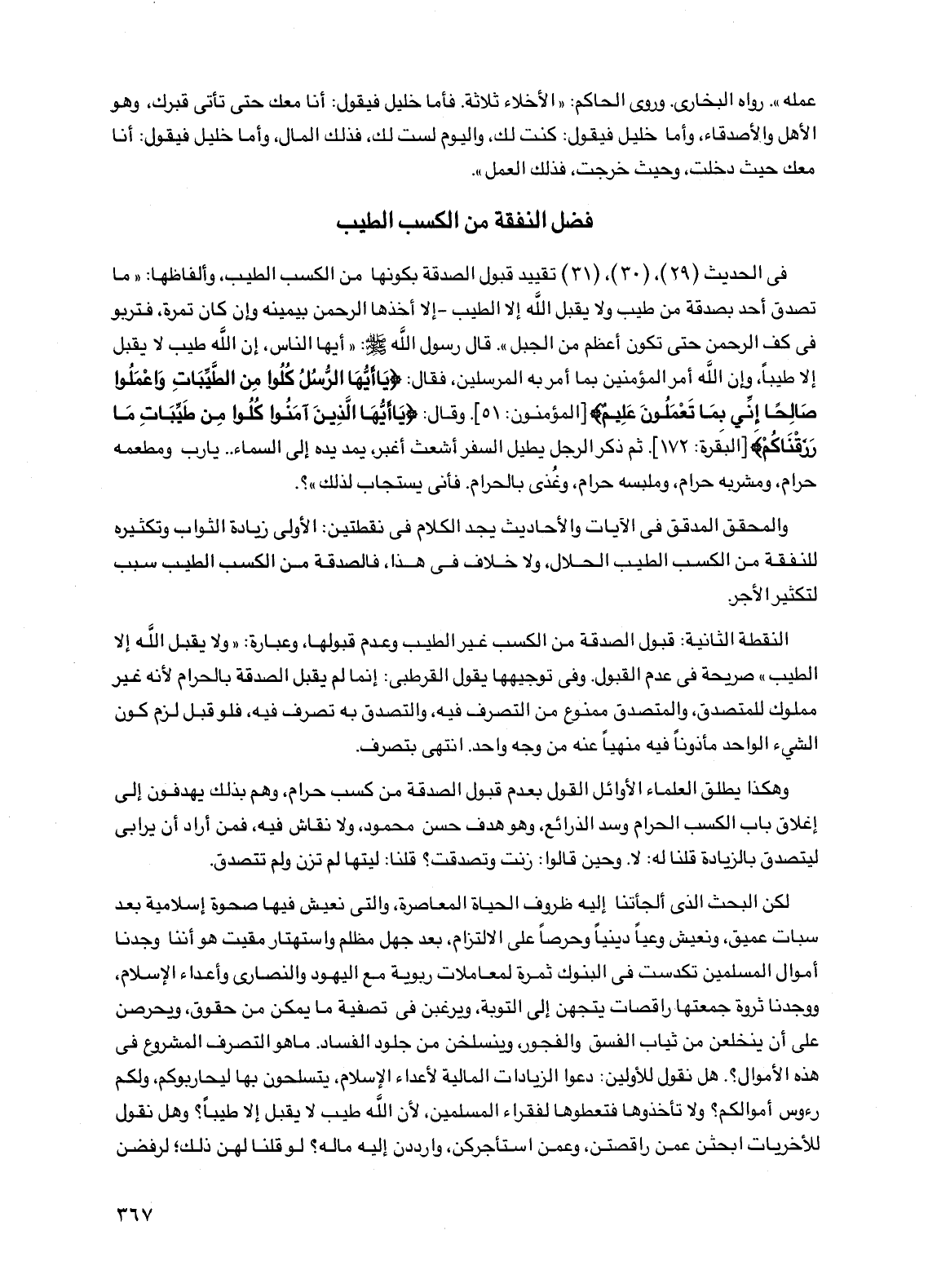في الحديث (29)، (30)، (31) تقييد قبول الصدقة بكونها من الكسب الطيب، وألفاظها: "ما تصدق أحد بصدقة من طيب ولا يقبل الله إلا الطيب- إلا أخذها الرحمن بيمينه وإن كان تمرة، فتربو في كف الرحمن حتى تكون أعظم من الجبل". قال رسول الله صلى الله عليه وسلم: "أيها الناس، إن الله طيب لا يقبل إلا طيباً، وإن الله أمر المؤمنين بما أمر به المرسلين، فقال: {يا أيها الرسل كلوا من الطيبات واعملوا صالحاً إني بما تعملون عليم} [المؤمنون: 51]. وقال: {يا أيها الذين آمنوا كلوا من طيبات ما رزقناكم} [البقرة: 172]. ثم ذكر الرجل يطيل السفر أشعث أغبر، يمد يده إلى السماء .. يا رب ومطعمه حرام، ومشربه حرام، وملبسه حرام، وغذي بالحرام. فأنى يستجاب لذلك"؟