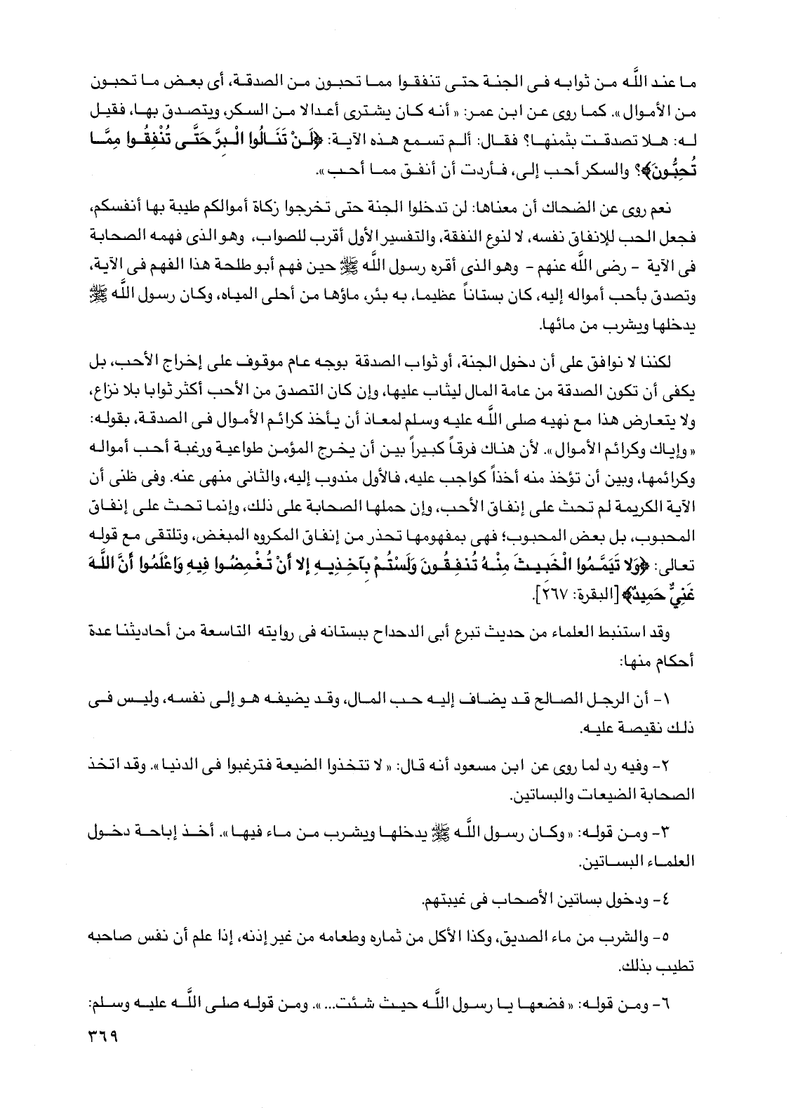 لكننا لا نوافق على أن دخول الجنة، أو ثواب الصدقة بوجه عام موقوف على إخراج الأحب، بل يكفي أن تكون الصدقة من عامة المال ليثاب عليها، وإن كان التصدق من الأحب أكثر ثواباً بلا نزاع، ولا يتعارض هذا مع نهيه صلى الله عليه وسلم لمعاذ أن يأخذ كرائم الأموال في الصدقة، بقوله: "وإياك وكرائم الأموال". لأن هناك فرقاً كبيراً بين أن يخرج المؤمن طواعية ورغبة أحب أمواله وكرائمها، وبين أن تؤخذ منه أخذاً كواجب عليه، فالأول مندوب إليه، والثاني منهي عنه. وفي ظني أن الآية الكريمة لم تحث على إنفاق الأحب، وإن حملها الصحابة على ذلك، وإنما تحث على إنفاق المحبوب، بل بعض المحبوب؛ فهي بمفهومها تحذر من إنفاق المكروه المبغض، وتلتقي مع قوله تعالى: {ولا تيمموا الخبيث منه تنفقون ولستم بآخذيه إلا أن تغمضوا فيه واعلموا أن الله غني حميد} [البقرة: 267].