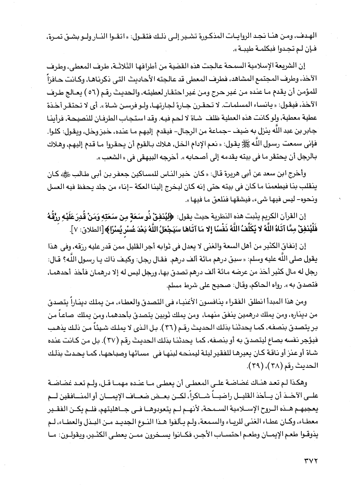 ومن هذا المبدأ انطلق الفقراء ينافسون الأغنياء في التصدق والعطاء، من يملك ديناراً يتصدق من ديناره، ومن يملك درهمين ينفق منهما، ومن يملك ثوبين يتصدق بأحدهما، ومن يملك صاعاً من بر يتصدق بنصفه، كما يحدثنا بذلك الحديث رقم (36). بل الذي لا يملك شيئاً من ذلك يذهب فيؤجر نفسه بصاع ليتصدق به أو بنصفه، كما يحدثنا بذلك الحديث رقم (37). بل من كانت عنده شاة أو عنز أو ناقة كان يعيرها للفقير ليلة ليمنحه لبنها في مسائها وصباحها، كما يحدث بذلك الحديث رقم (38)، (39).