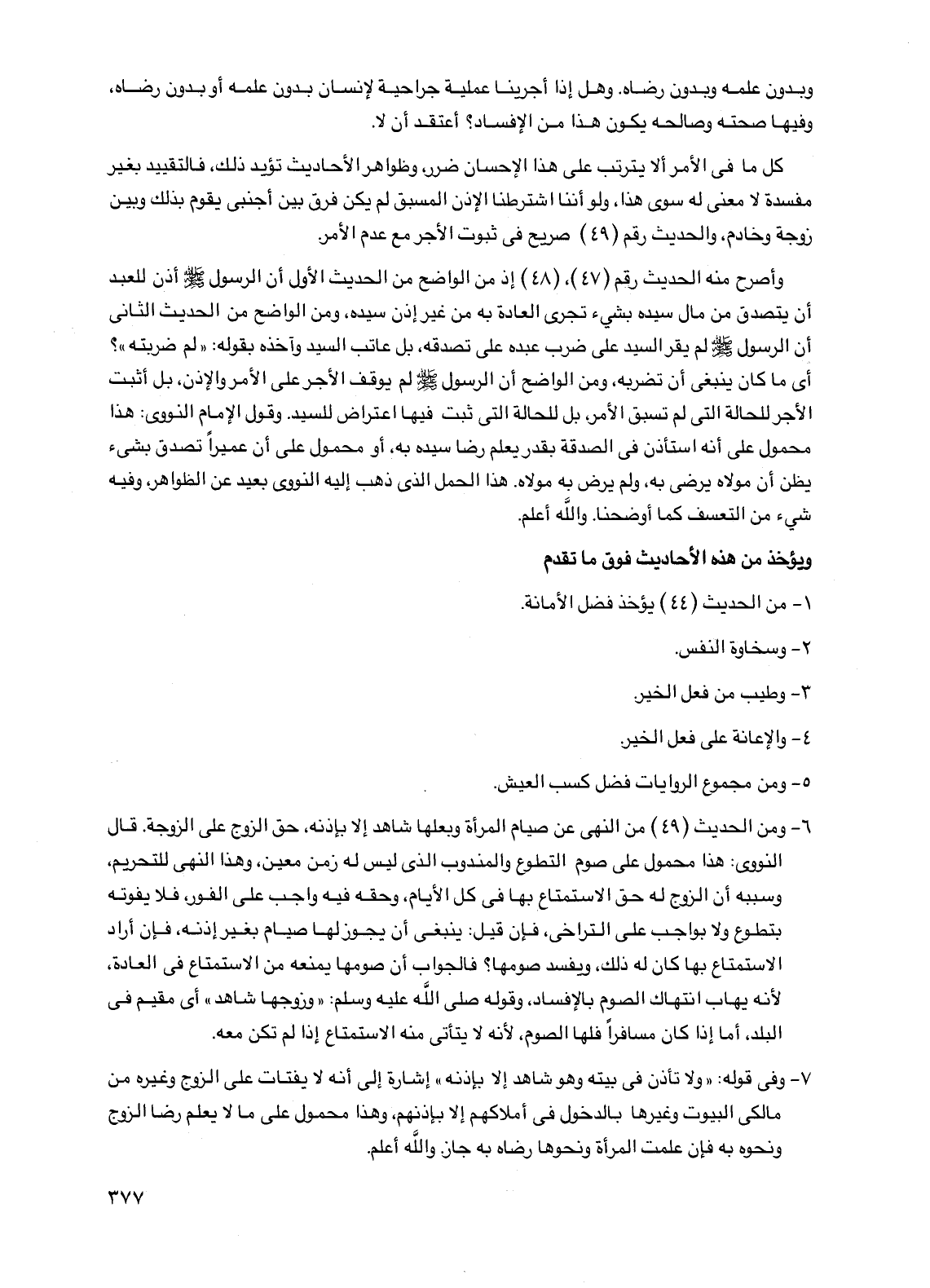 وأصرح منه الحديث رقم (47)، (48) إذ من الواضح من الحديث الأول أن الرسول صلى الله عليه وسلم أذن للعبد أن يتصدق من مال سيده بشيء تجري العادة به من غير إذن سيده، ومن الواضح من الحديث الثاني أن الرسول صلى الله عليه وسلم لم يقر السيد على ضرب عبده على تصدقه، بل عاتب السيد وآخذه بقوله: "لم ضربته"؟ أي ما كان ينبغي أن تضربه، ومن الواضح أن الرسول صلى الله عليه وسلم لم يوقف الأجر على الأمر والإذن، بل أثبت الأجر للحالة التي لم تسبق الأمر، بل للحالة التي ثبت فيها اعتراض للسيد. وقول الإمام النووي: هذا محمول على أنه استأذن في الصدقة بقدر يعلم رضا سيده به، أو محمول على أن عميراً تصدق بشيء يظن أن مولاه يرضى به، ولم يرض به مولاه. هذا الحمل الذي ذهب إليه النووي بعيد عن الظواهر، وفيه شيء من التعسف كما أوضحنا. والله أعلم.