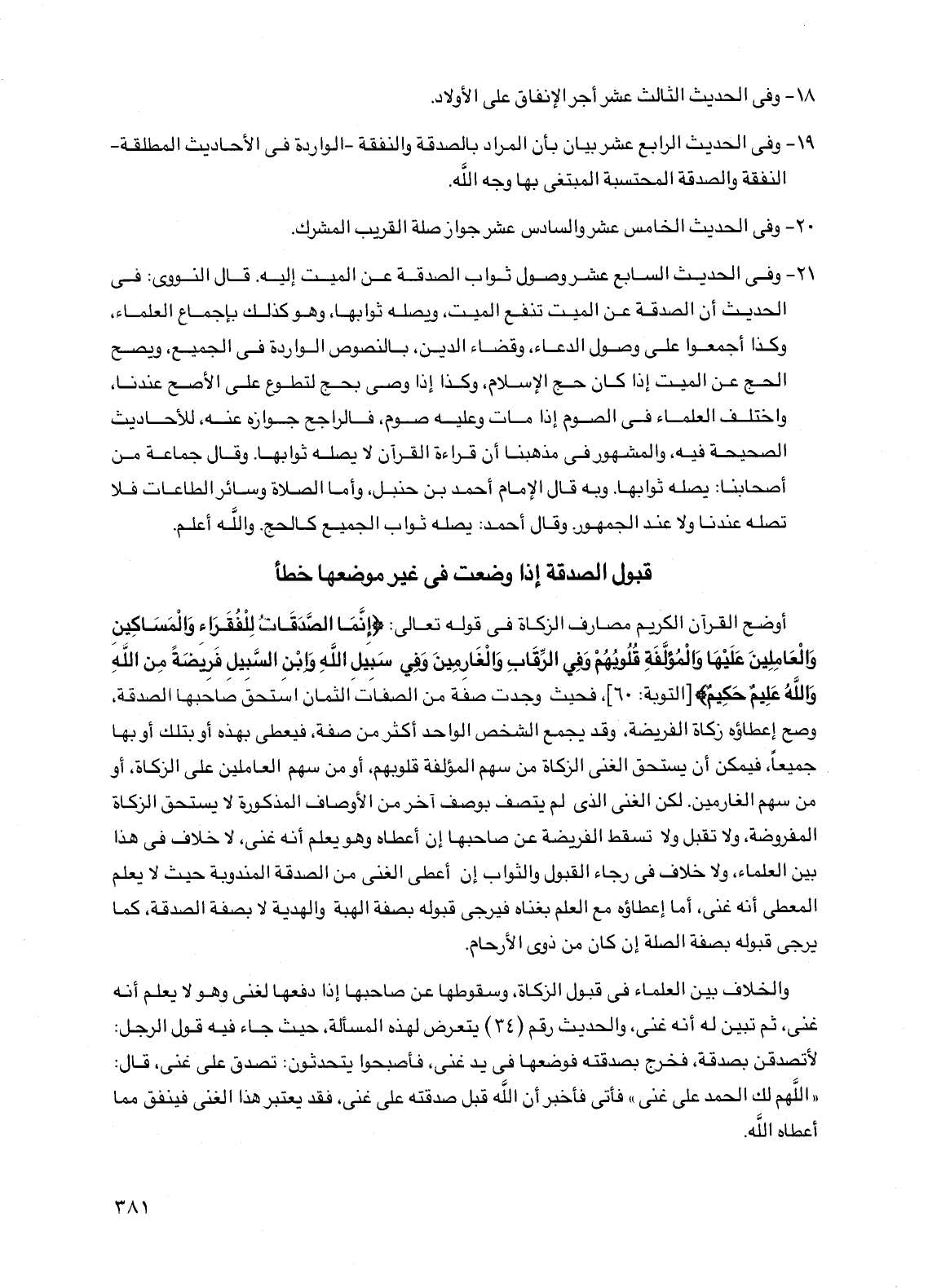 والخلاف بين العلماء في قبول الزكاة، وسقوطها عن صاحبها إذا دفعها لغني وهو لا يعلم أنه غني، ثم تبين له أنه غني، والحديث رقم (34) يتعرض لهذه المسألة، حيث جاء فيه قول الرجل: لأتصدقن بصدقة، فخرج بصدقته فوضعها في يد غني، فأصبحوا يتحدثون: تصدق على غني، قال: "اللهم لك الحمد على غنى" فأتى فأخبر أن الله قبل صدقته على غني، فقد يعتبر هذا الغني فينفق مما أعطاه الله.