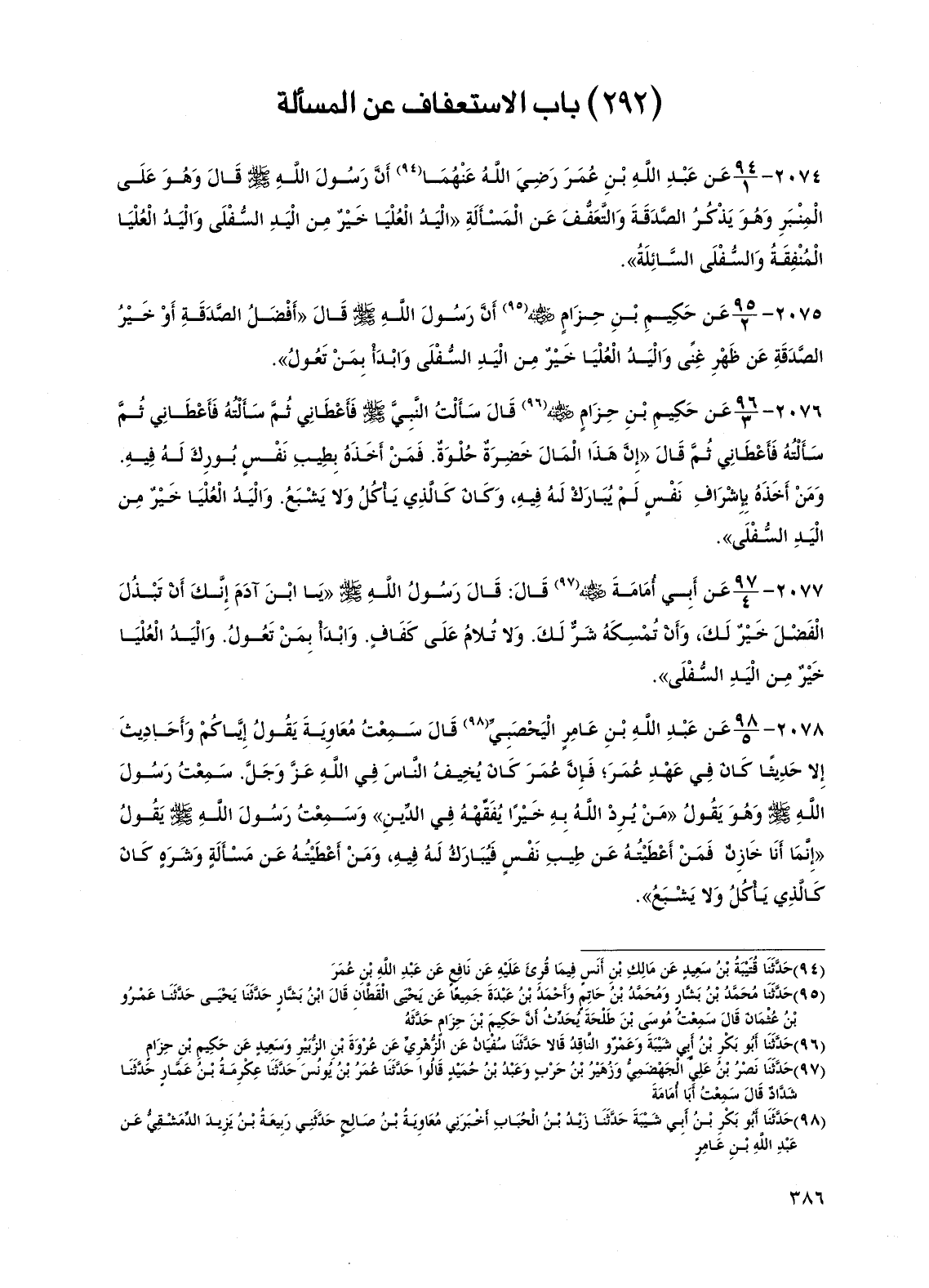 2076 - عن حكيم بن حزام رضي الله عنه قال سألت النبي صلى الله عليه وسلم فأعطاني ثم سألته فأعطاني ثم سألته فأعطاني ثم قال "إن هذا المال خضرة حلوة. فمن أخذه بطيب نفس بورك له فيه. ومن أخذه بإشراف نفس لم يبارك له فيه، وكان كالذي يأكل ولا يشبع. واليد العليا خير من اليد السفلى".