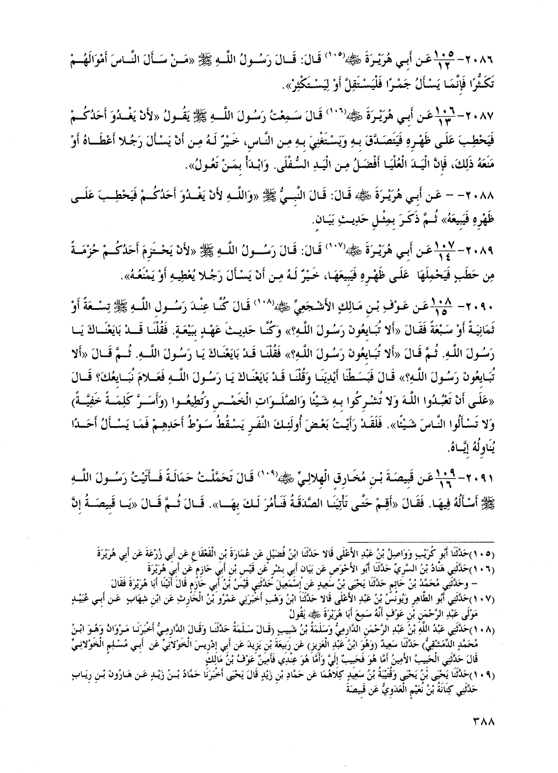 2091 - عن قبيصة بن مخارق الهلالي رضي الله عنه قال تحملت حمالة فأتيت رسول الله صلى الله عليه وسلم أسأله فيها. فقال "أقم حتى تأتينا الصدقة فنأمر لك بها". قال ثم قال "يا قبيصة إن