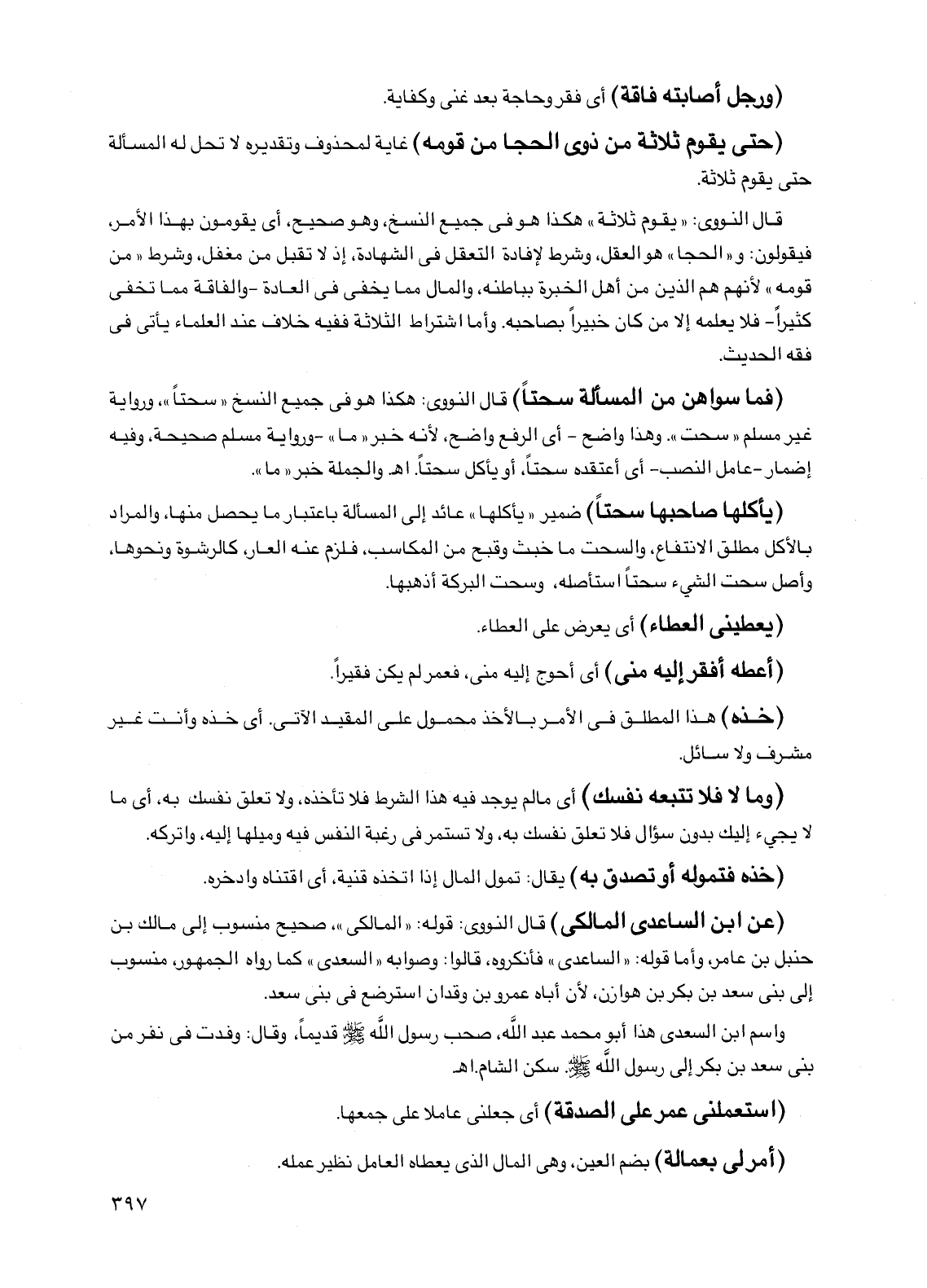 قال النووي: "يقوم ثلاثة" هكذا هو في جميع النسخ، وهو صحيح، أي يقومون بهذا الأمر، فيقولون: و"الحجا" هو العقل، وشرط لإفادة التعقل في الشهادة، إذ لا تقبل من مغفل، وشرط "من قومه" لأنهم هم الذين من أهل الخبرة بباطنه، والمال مما يخفى في العادة -والفاقة مما تخفى كثيراً- فلا يعلمه إلا من كان خبيراً بصاحبه. وأما اشتراط الثلاثة ففيه خلاف عند العلماء يأتي في فقه الحديث.