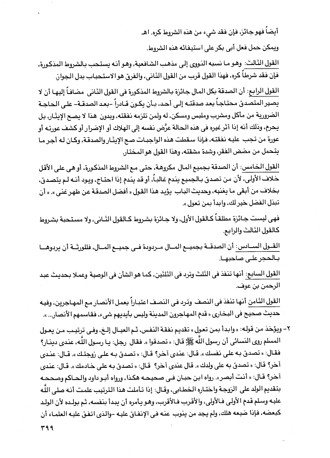 القول الرابع: أن الصدقة بكل المال جائزة بالشروط المذكورة في القول الثاني مضافاً إليها أن لا يصير المتصدق محتاجاً بعد صدقته إلى أحد، بأن يكون قادراً -بعد الصدقة- على الحاجة الضرورية من مأكل ومشرب وملبس ومسكن، له ولمن تلزمه نفقته، وبدون هذا لا يصح الإيثار، بل يحرم، وذلك أنه إذا آثر غيره في هذه الحالة عرض نفسه إلى الهلاك أو الإضرار أو كشف عورته أو عورة من تجب عليه نفقته، فإذا سقطت هذه الواجبات صح الإيثار والصدقة، وكان له أجر ما يتحمل من مضض الفقر، وشدة مشقته، وهذا القول هو المختار.