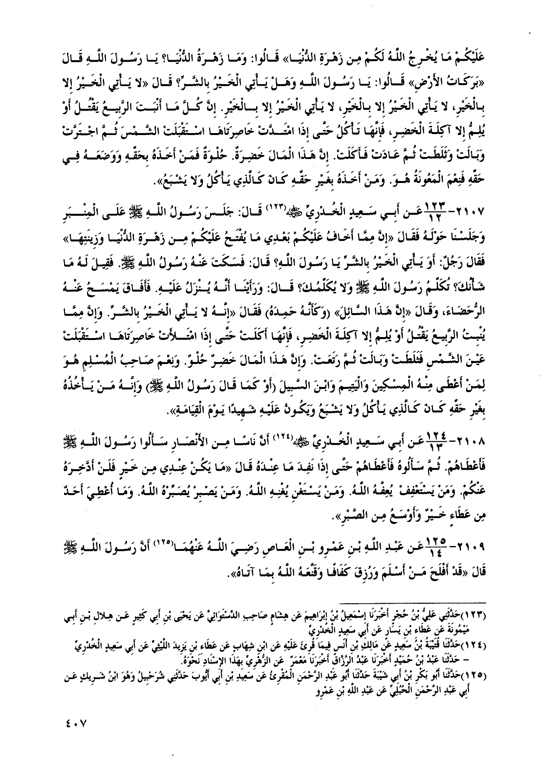 عليكم ما يخرج الله لكم من زهرة الدنيا" قالوا: وما زهرة الدنيا؟ يا رسول الله قال "بركات الأرض" قالوا: يا رسول الله وهل يأتي الخير بالشر؟ قال "لا يأتي الخير إلا بالخير، لا يأتي الخير إلا بالخير، لا يأتي الخير إلا بالخير. إن كل ما أنبت الربيع يقتل أو يلم إلا آكلة الخضر، فإنها تأكل حتى إذا امتدت خاصرتاها استقبلت الشمس ثم اجترت وبالت وثلطت ثم عادت فأكلت. إن هذا المال خضرة. حلوة فمن أخذه بحقه ووضعه في حقه فنعم المعونة هو. ومن أخذه بغير حقه كان كالذي يأكل ولا يشبع".