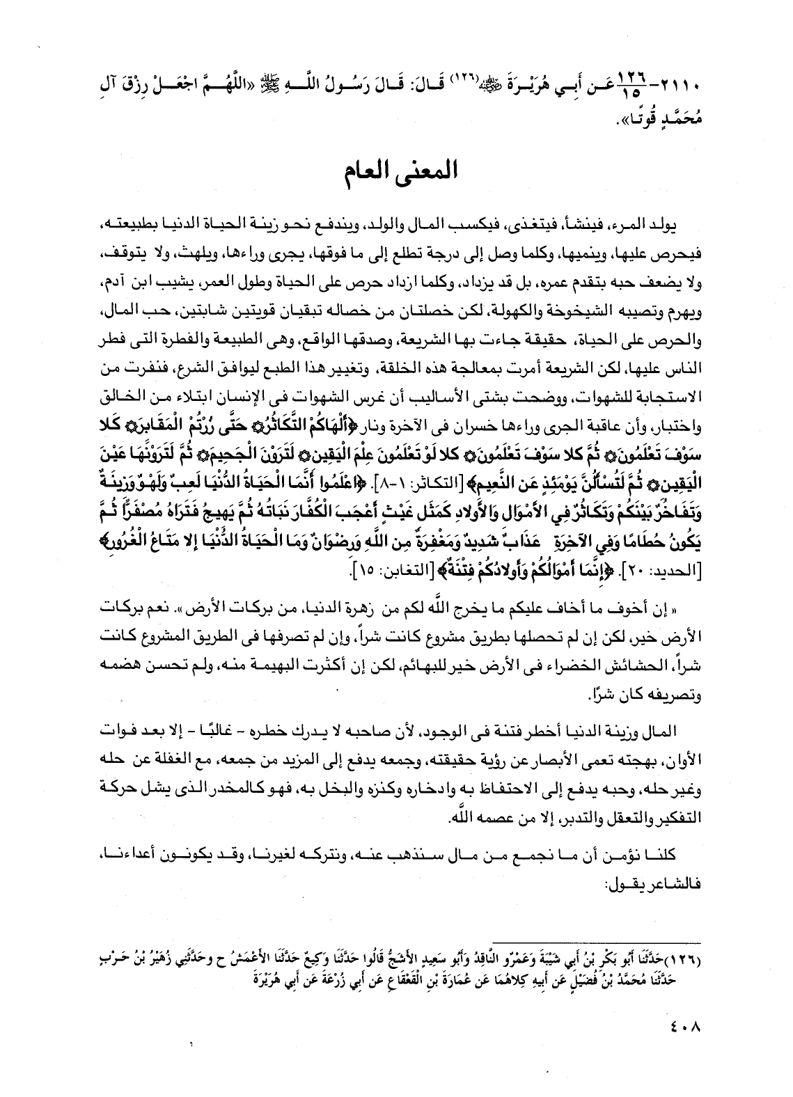 2110 - عن أبي هريرة رضي الله عنه قال: قال رسول الله صلى الله عليه وسلم "اللهم اجعل رزق آل محمد قوتاً".