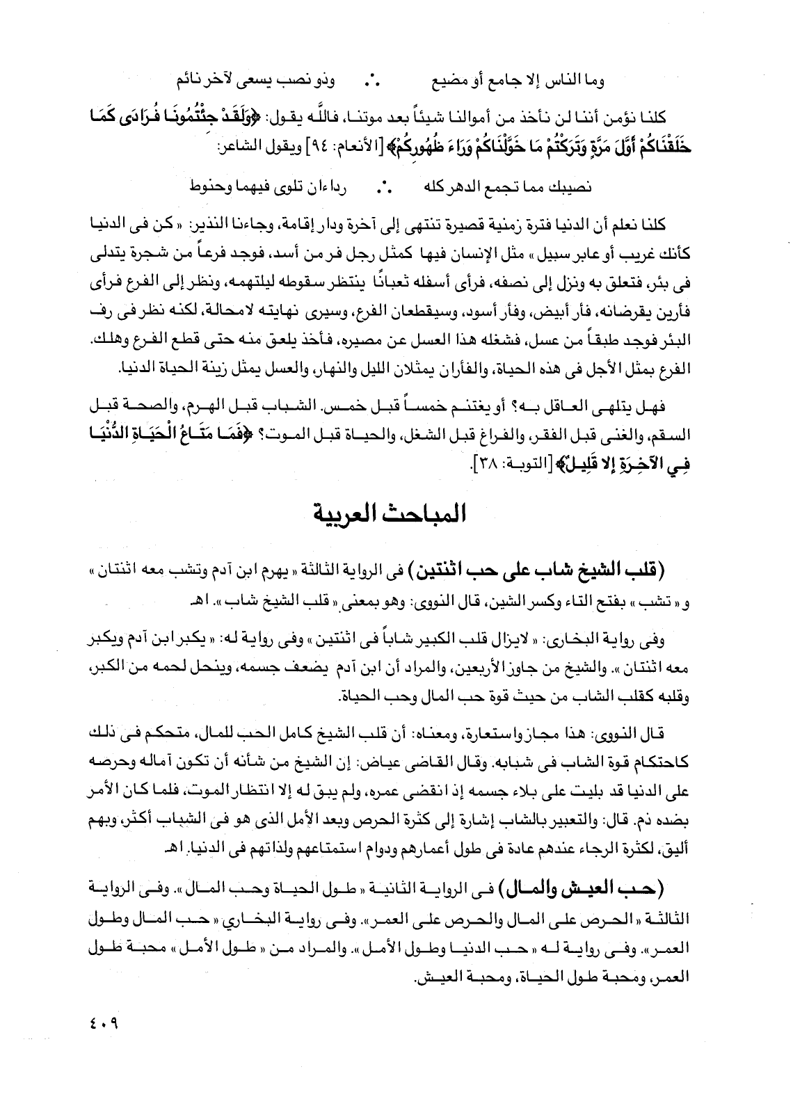 وفي رواية البخاري: "لا يزال قلب الكبير شاباً في اثنتين" وفي رواية له: "يكبر ابن آدم ويكبر معه اثنتان". والشيخ من جاوز الأربعين، والمراد أن ابن آدم يضعف جسمه، وينحل لحمه من الكبر، وقلبه كقلب الشاب من حيث قوة حب المال وحب الحياة.