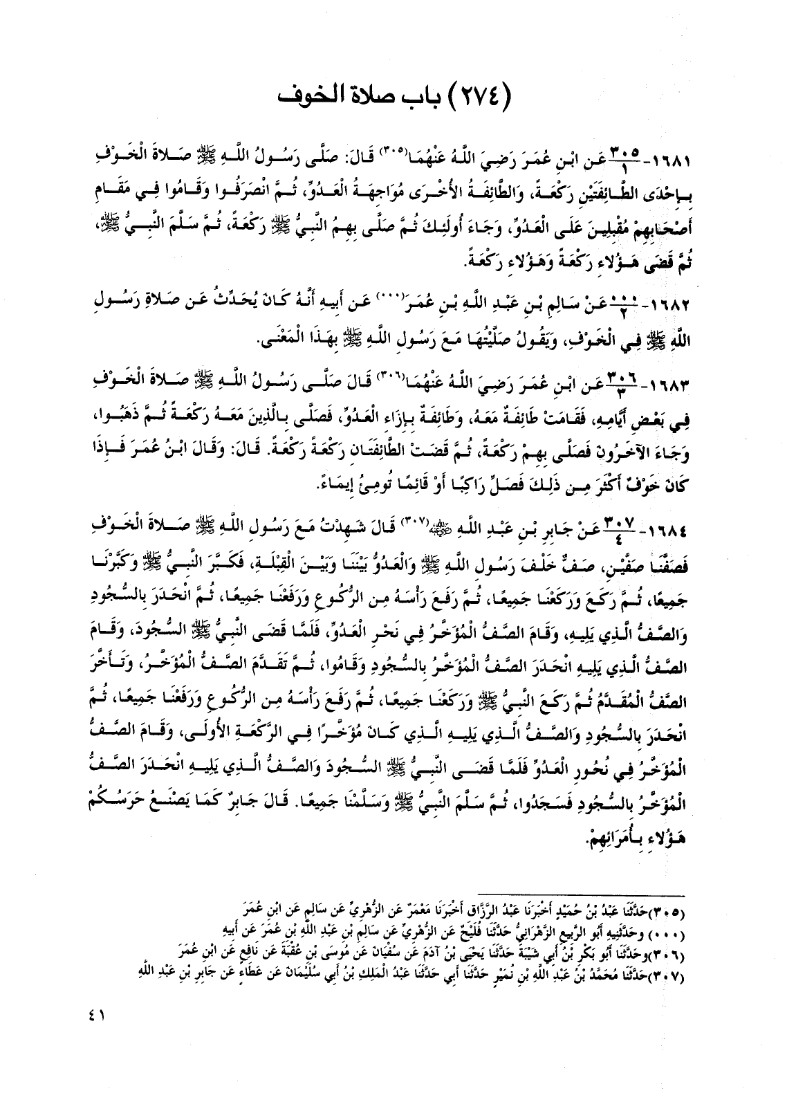 1684 - عن جابر بن عبد الله رضي الله عنه قال شهدت مع رسول الله صلى الله عليه وسلم صلاة الخوف فصفنا صفين، صف خلف رسول الله صلى الله عليه وسلم والعدو بيننا وبين القبلة، فكبر النبي صلى الله عليه وسلم وكبرنا جميعاً، ثم ركع وركعنا جميعاً، ثم رفع رأسه من الركوع ورفعنا جميعاً، ثم انحدر بالسجود والصف الذي يليه، وقام الصف المؤخر في نحر العدو فلما قضى النبي صلى الله عليه وسلم السجود وقام الصف الذي يليه انحدر الصف المؤخر بالسجود وقاموا، ثم تقدم الصف المؤخر، وتأخر الصف المقدم ثم ركع النبي صلى الله عليه وسلم وركعنا جميعاً، ثم رفع رأسه من الركوع ورفعنا جميعاً، ثم انحدر بالسجود والصف الذي يليه الذي كان مؤخراً في الركعة الأولى، وقام الصف المؤخر في نحور العدو فلما قضى النبي صلى الله عليه وسلم السجود والصف الذي يليه انحدر الصف المؤخر بالسجود فسجدوا، ثم سلم النبي صلى الله عليه وسلم وسلمنا جميعاً. قال جابر كما يصنع حرسكم هؤلاء بأمرائهم.